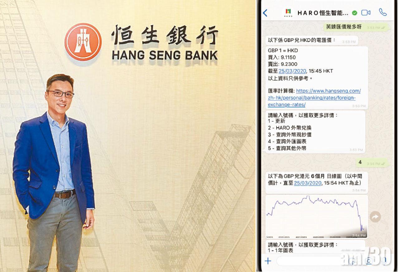 新冠肺炎疫情肆虐下,市民盡量減少外出,對網上銀行服務需求增加。恒生銀行(011)最新推出「HARO WhatsApp」,數碼銀行主管鄭維章(Herman)接受訪問時表示,透過WhatsApp可與該行智能助理「HARO」對話查詢,獲得最新的銀行服務資訊。相關服務更不只限該行客戶,市民大眾亦可享用。