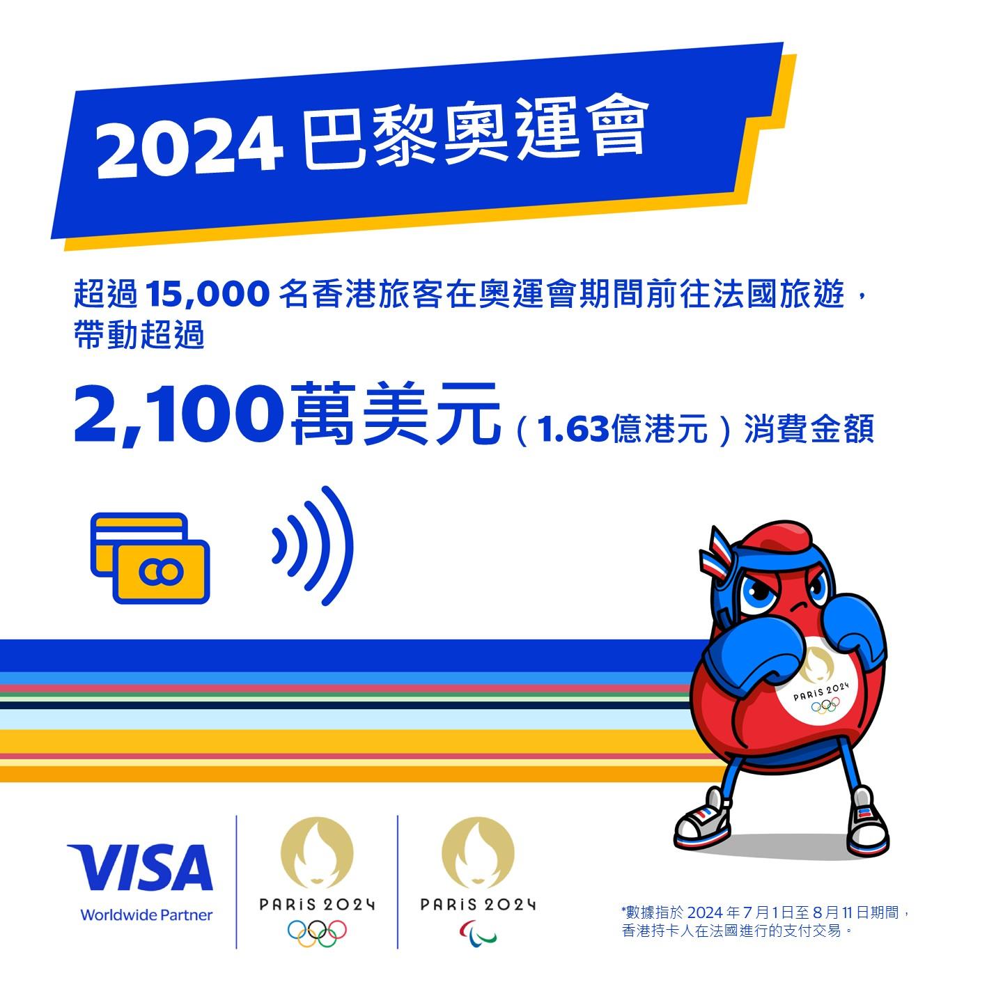 Visa公布最新數據,指在奧運期間,1.5萬名香港旅客(持卡人)在法國消費1.63億港元,金額領先亞太區。在平均6天的行程中,香港旅客日均消費逾230美元(折合約1,800港元),是亞太區內每日消費金額最高的地區,而旅程當中的消費金額亦較行程開始前增加3.4倍,逾1.5萬名香港旅客的消費總額逾2,100萬美元(折合約1.63億港元)。