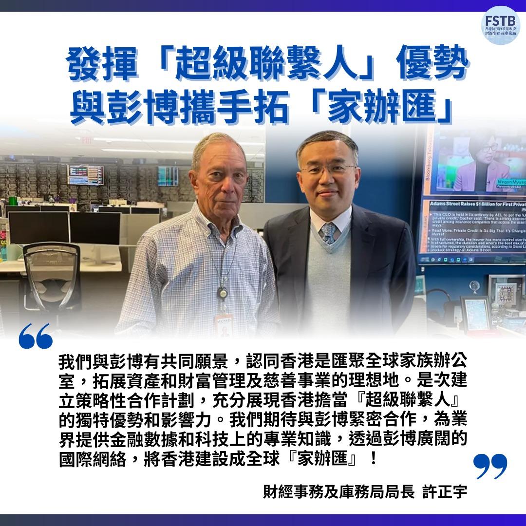 財庫局長許正宇表示,與彭博有共同願景,認同香港是匯聚全球家族辦公室,拓展資產和財富管理及慈善事業的理想地。是次建立策略性合作計劃,充分展現香港擔當「超級聯繫人」的獨特優勢和影響力,期待合作為業界提供金融數據和科技上的專業知識,透過彭博廣闊的國際網絡,將香港建設成全球「家辦匯」!