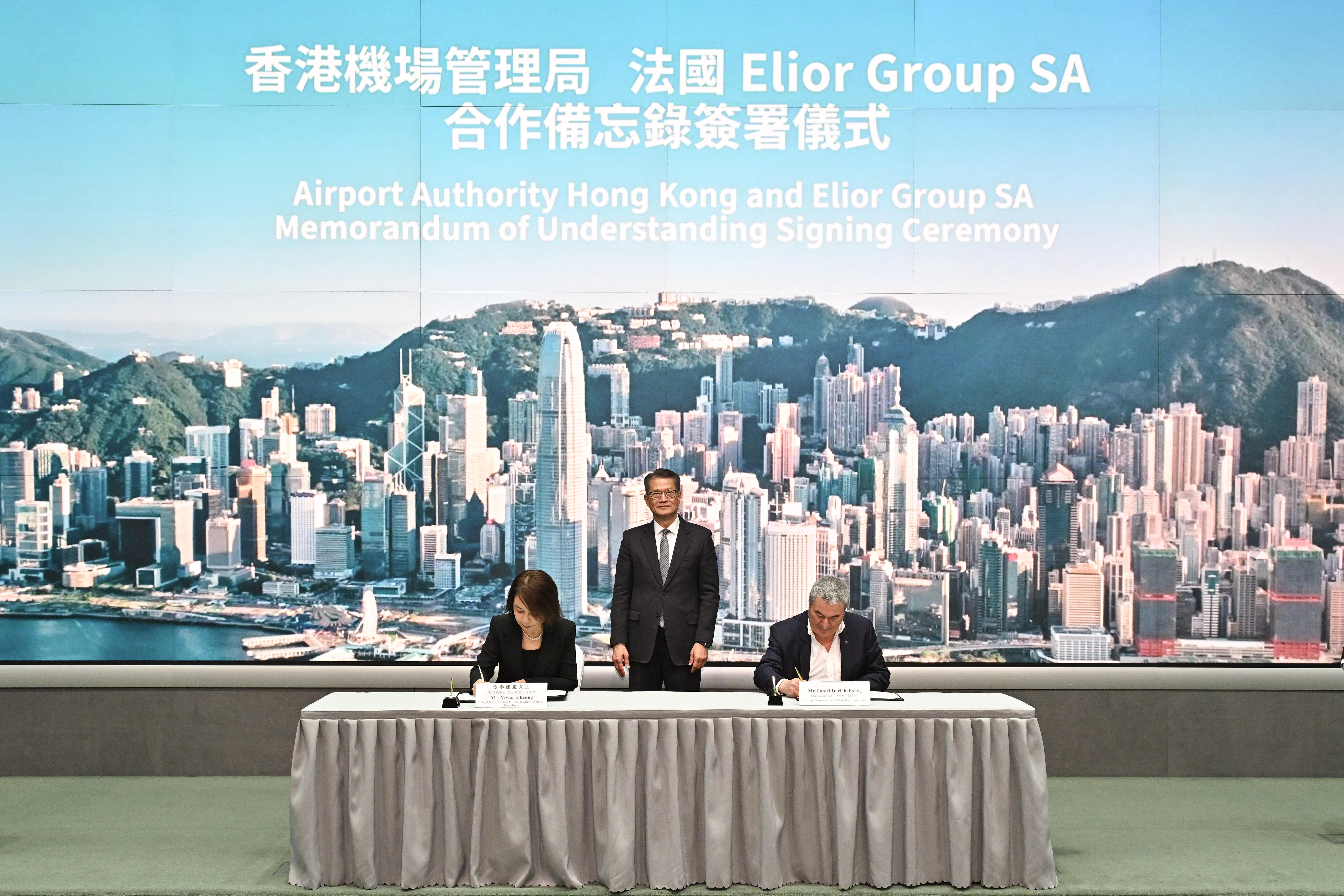 Elior Group SA主席Daniel Derichebourg(右),在陳茂波見證下,與香港機管局署理行政總裁張李佳蕙簽署了合作備忘錄。(政府新聞處圖)