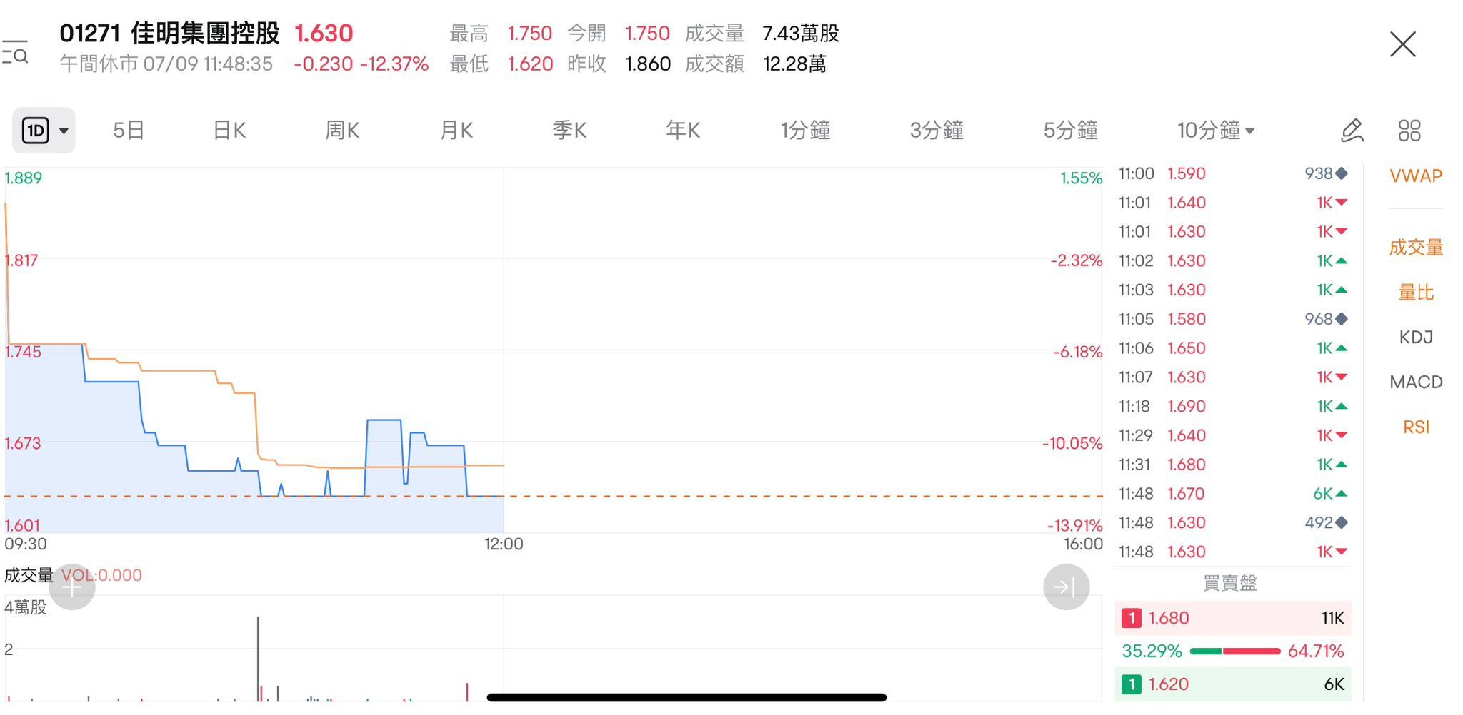 【7月9日更新】地產發展商佳明集團(1271)半日股價挫12.3%,報1.63元,成交量7.43萬股,成交額僅12.28萬元。消息面上,佳明集團周二(8日)公布,因未能達財務契諾,令部分銀行貸款融資觸發違反事項,銀行有權要求即時還款(call Loan)。