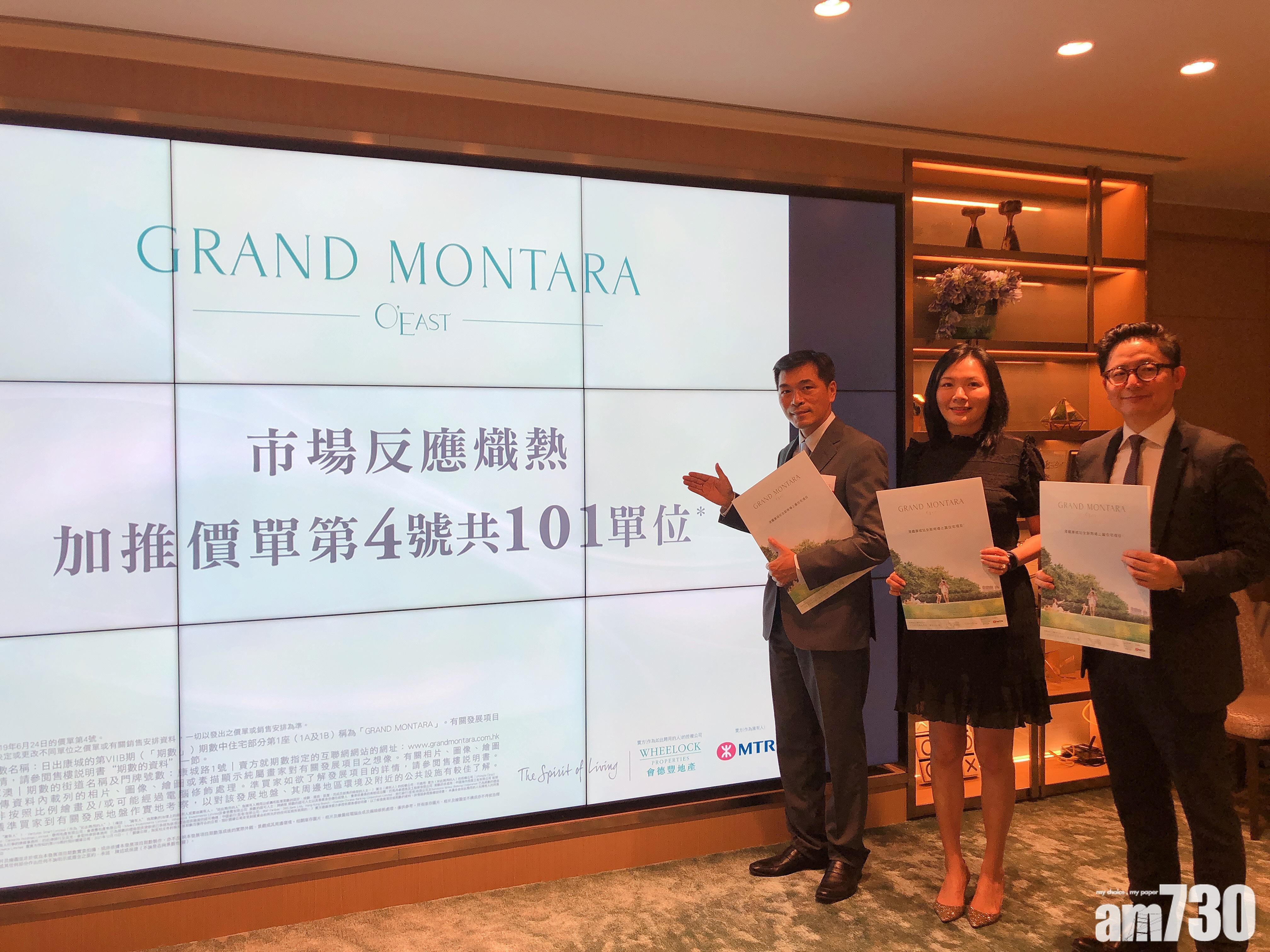 會德豐地產(020)常務董事黃光耀表示,旗下將軍澳日出康城7B期「GRAND MONTARA」提價加推第4號價單,涉101伙。若撇除景觀、樓層等因素,實際加幅約1%至1.5%,預計最快周末開售。