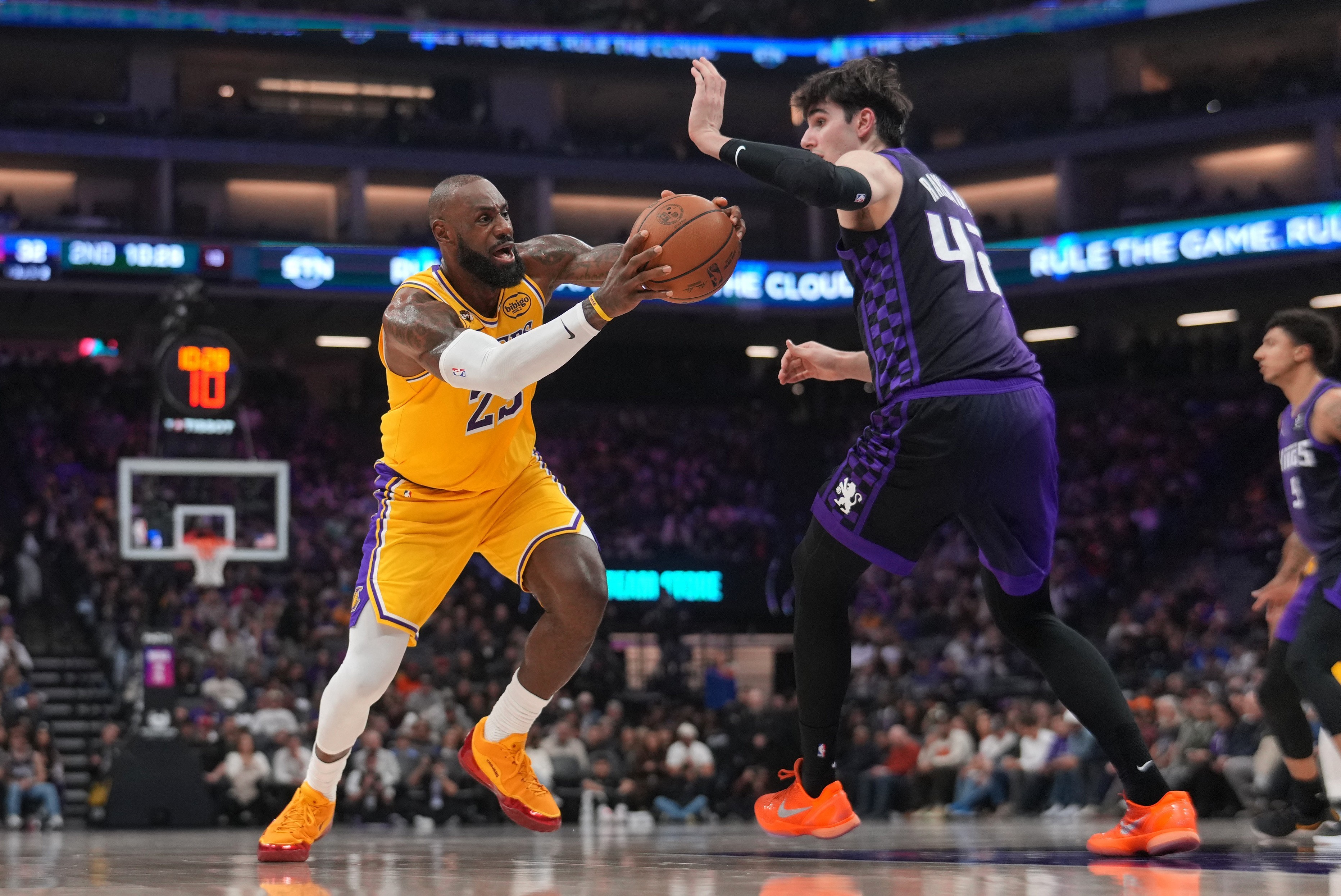 勒邦占士穿上有紀念他第23個賽季的紀念章球衣,不過洛杉磯湖人以112:124不敵薩克拉門托帝王。(美聯社)