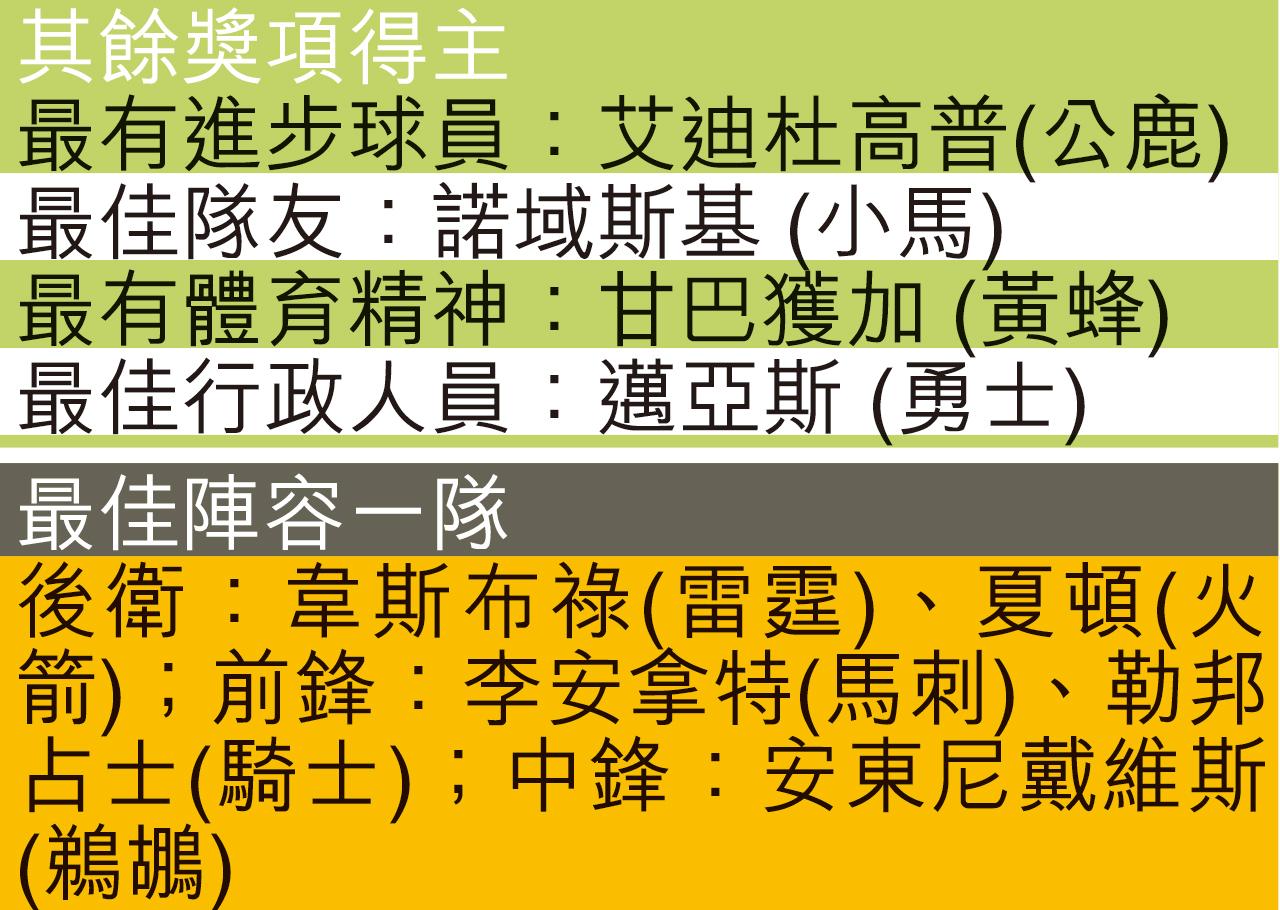 終身成就獎方面,已事先張揚由塞爾特人名宿、曾11奪總冠軍的標羅素獲得;以去年因癌病逝世的記者沙格命名、今季首次頒發的沙格成就獎,由馬刺籃球行政副總裁蒙迪威廉斯奪得,他去年2月擔任雷霆助教期間,妻子不幸因車禍喪身,但他仍然堅強地生活,撫養5位子女。