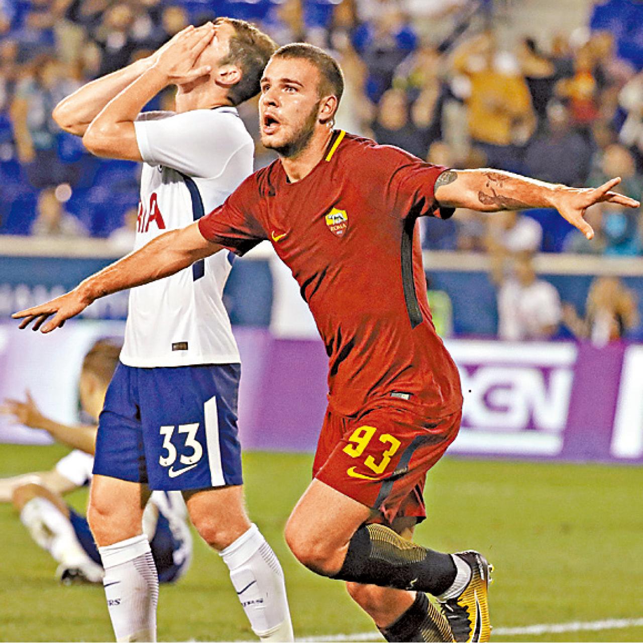 返回 體育 出版:2017-Jul-27 06:00 更新:2017-Jul-27 06:00 圖片新聞:絕殺 分享: 熱刺於新澤西舉行的國冠盃與羅馬交鋒,最終以2比3飲恨。羅馬憑柏洛迪射入12碼先開紀錄,至70分鐘由辛基斯安達射成2比0。熱刺完場前由哈利雲克斯及雲遜贊臣接連建功而扳平,但18歲小將杜米尼路(右)至補時涉嫌在先犯規下門前射入,為羅馬絕殺對手。 (美聯社) ADVERTISEMENT送大埔超級城《金馬喜迎春》禮盒