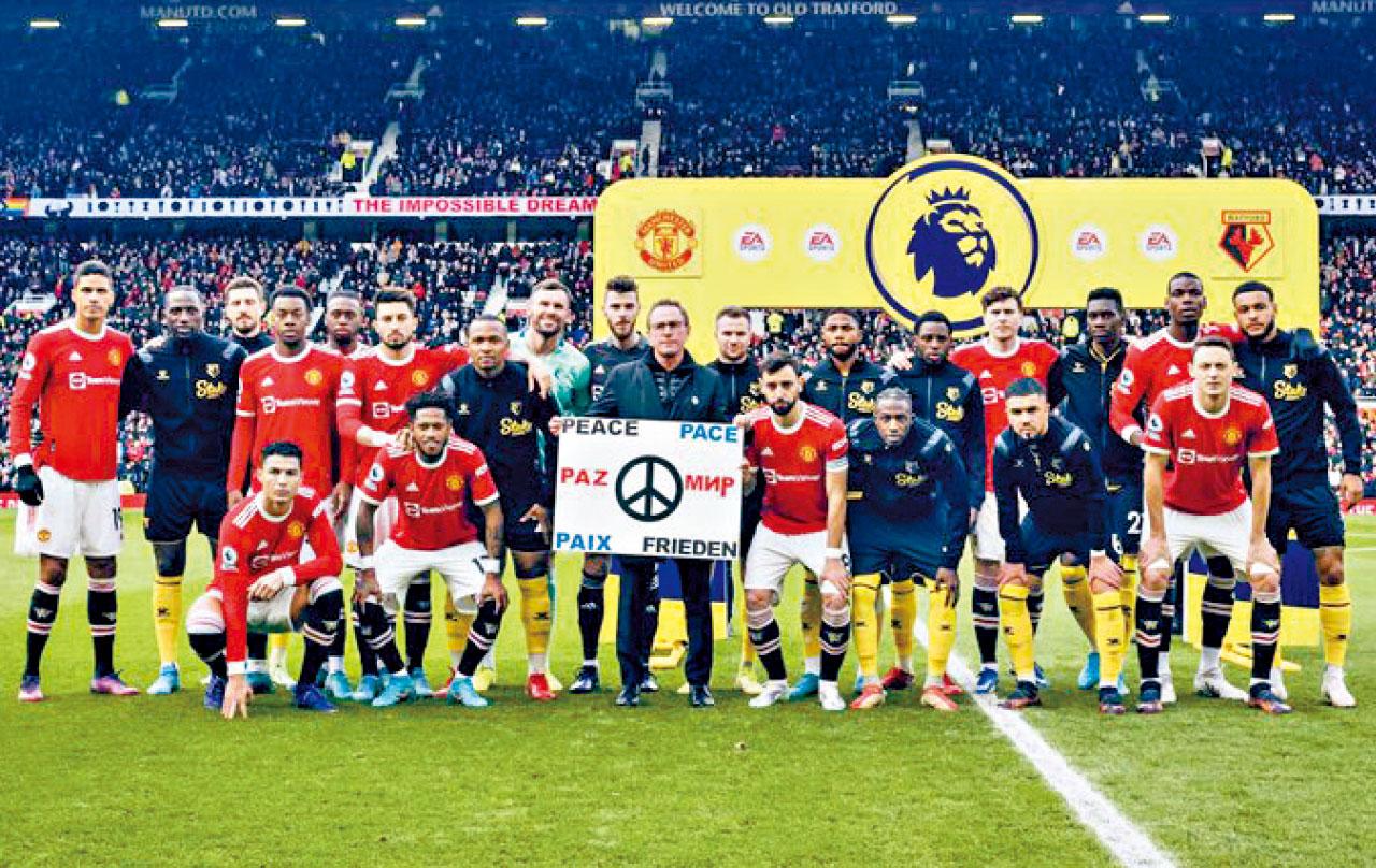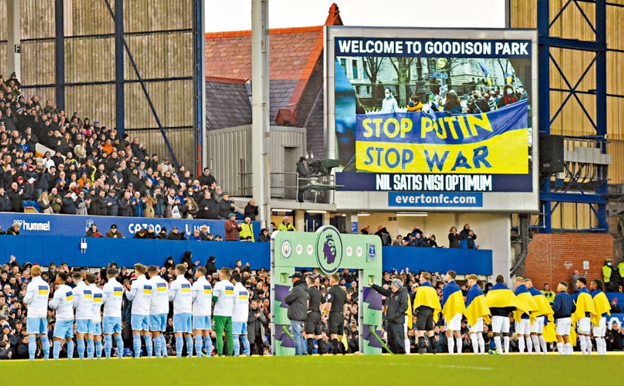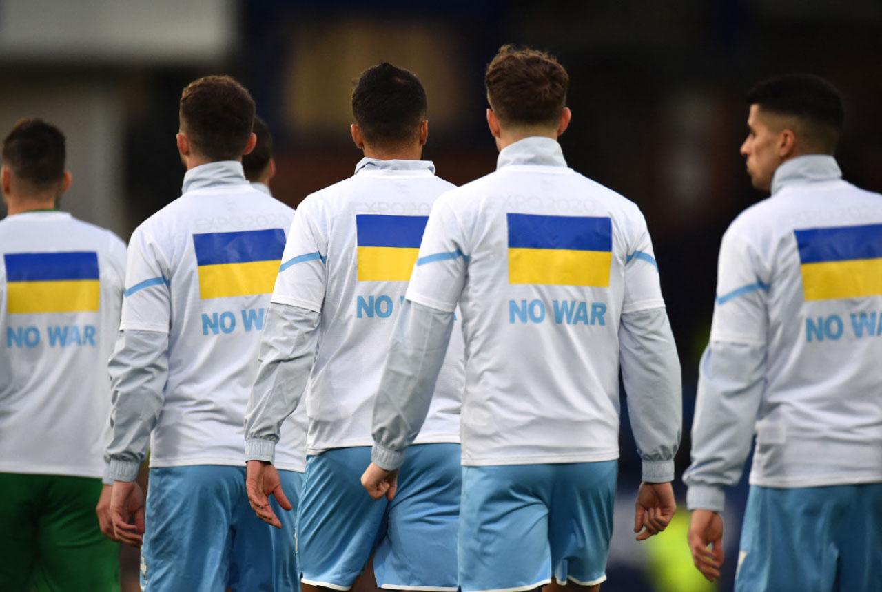 體壇各界回應俄烏戰火,其中愛華頓對曼城之戰,賽前主隊後衛米高蘭高與曼城辛真高相擁,球迷熱烈掌聲支持,而葛迪遜公園球場內大電視及多幅橫額,展示反戰及為烏克蘭打氣的標語。兩隊賽前列隊時分別披起烏克蘭國旗及穿上印有烏克蘭國旗的反戰字樣外套登場。另邊廂,曼聯作客屈福特,賽前同樣舉起反戰紙牌。