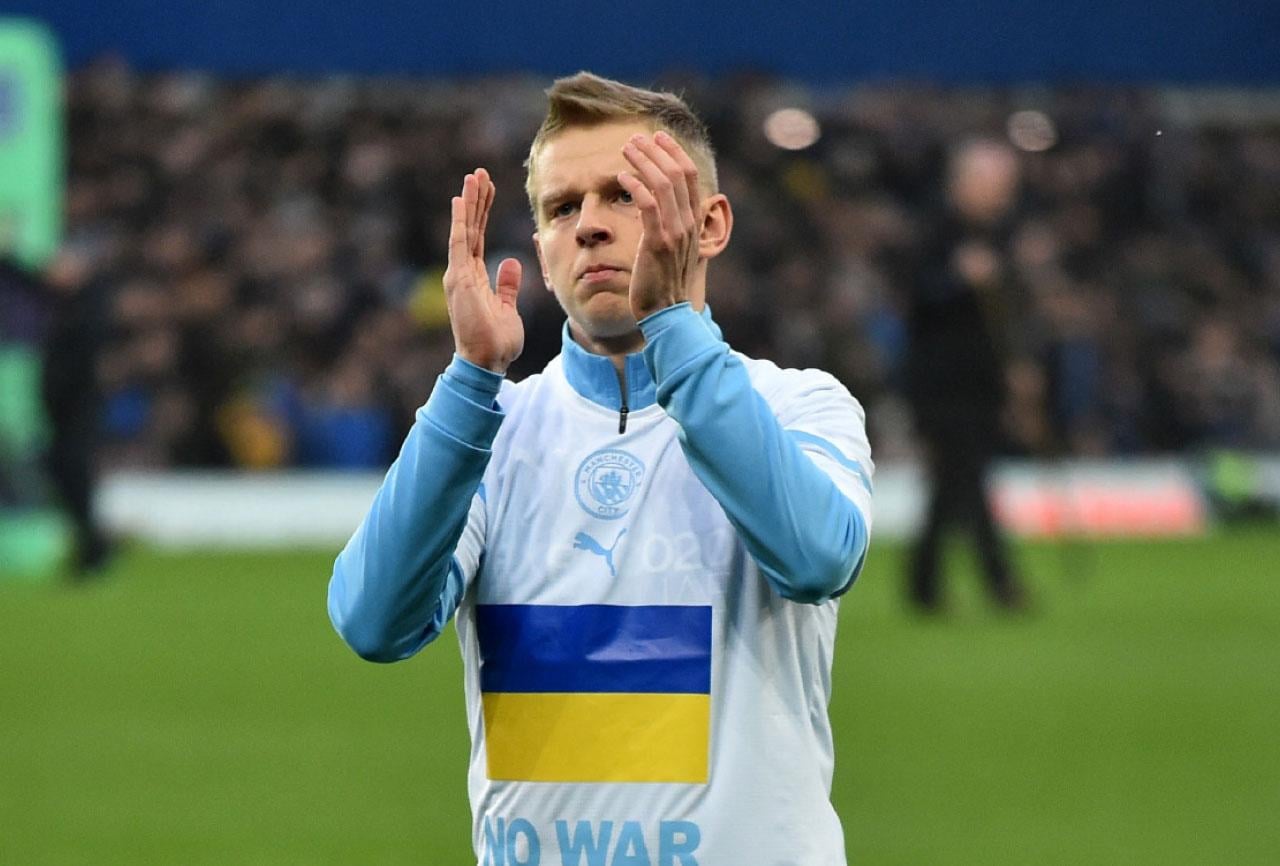 愛華頓對曼城,兩隊球員分別披烏國國旗及反戰外套出場。