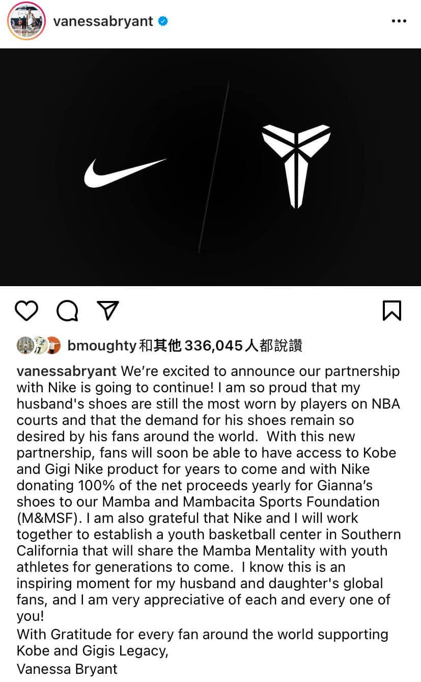 Vanessa Bryant亦在個人IG上宣布和Nike繼續合作,亦感謝NBA球員及外界依然穿起Kobe系列的球鞋,Vanessa Bryant說:「我很高興地宣佈,我們將繼續完成我丈夫在Nike的願望,期待透過與年輕運動員分享曼巴精神,傳承他與Gigi的精神。」
