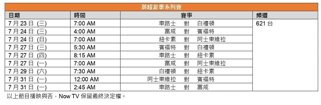 這邊曼聯季前熱身賽力戰多支歐洲勁旅,那邊六支英超強隊就選擇先來多輪內鬥,投入英超夏季系列 賽。美國從來是英超進行季前賽的熱門比賽地方,今夏更上演英超隊大亂鬥,由紐卡素、車路士、阿 士東維拉、賓福特、白禮頓與富咸角逐,共合對戰 9 場的夏季系列賽,簡直是新一季英超的預演。期 待紐卡素新簽的東拿利、車路士新簽安宮古以及本港球迷眾多的白禮頓三笘薰能在這個系列賽觸目登 場。