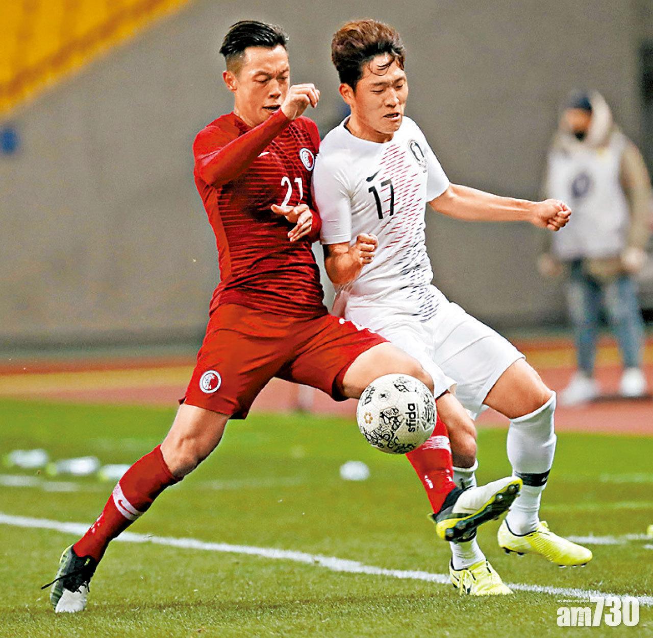 東亞足球錦標賽決賽周,香港足球代表隊於首場賽事硬撼主辦國南韓,踢出拚勁及防守不俗,可惜於上半場補時先被黃仁範主射罰球破關,至82分鐘再被羅相浩(右)接應二傳頂入,最終以0比2見負。(路透社)