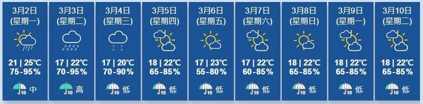 天文台展望明日驟雨較多,氣溫稍為下降。隨後數日早上稍涼,天色逐漸好轉。(香港天文台)