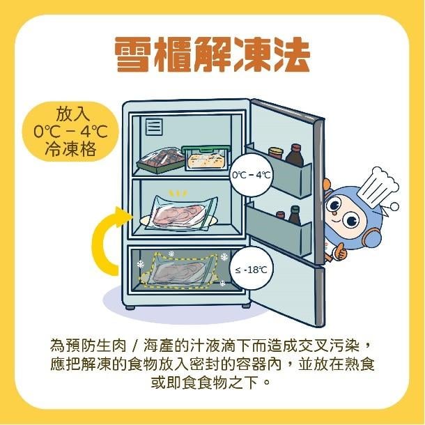 將需要解凍的食物,預先(例如烹煮前一日)放入雪櫃攝氏0至4度的冷凍格。要注意為預防生肉/海產汁液沾染其他食物,造成交叉污染,市民應該把解凍的食物放入密封容器內,再放在熟食或即食食物之下。