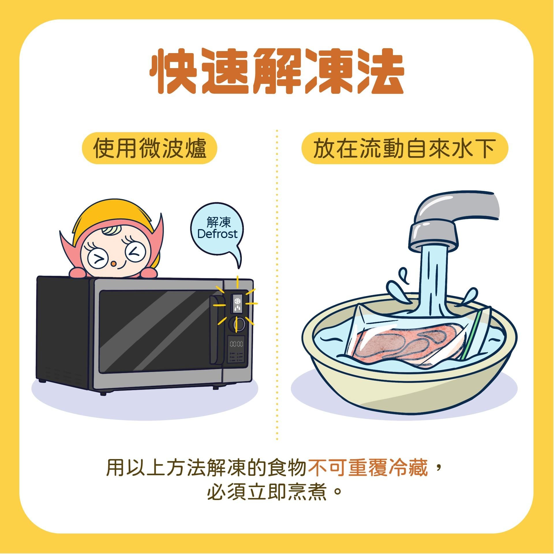 近期大家或會較多機會在家中預備冷藏食物烹煮。那麼你懂得如何安心解凍冷藏食物嗎?如果解凍不徹底,可能令食物在烹煮時較難被徹底煮熟;而靠放在室溫下解凍,由於需時較長,會令被冰封而進入休眠的細菌重新孳長!因此,為確保食物安全,大家應採用以下正確的解凍食物方法。