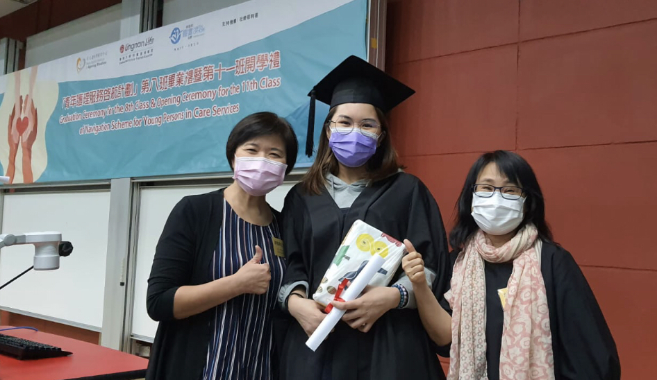 Agnes(中)去年畢業時,與僱主代表寧養院護士長陳佩清(左)和郭艷嫦(右)合照。