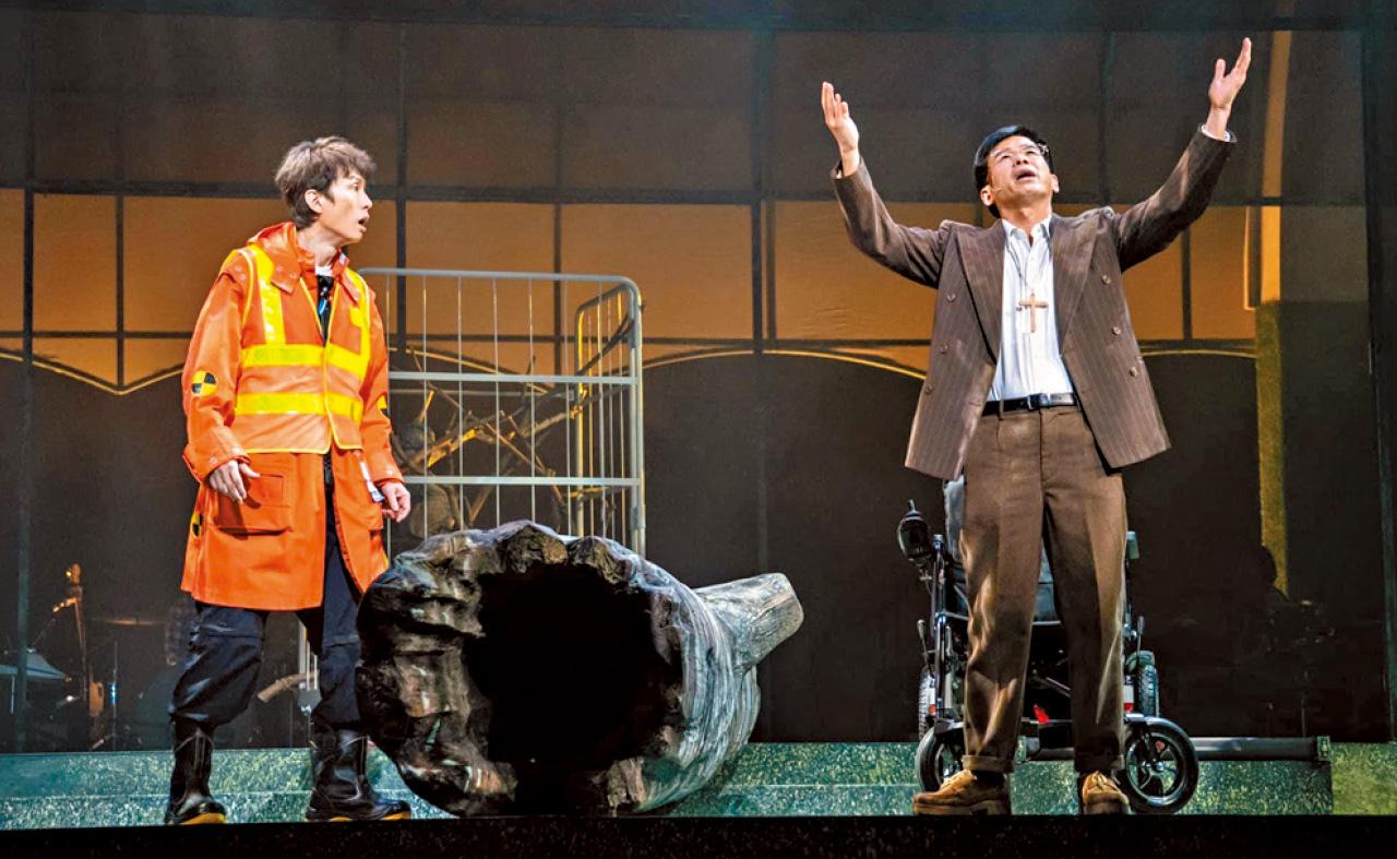 3) 事實上,由頭做到尾兩個半鐘有多(包括中場休息)的時間裡,戲曲中心的台上,大部分時間都只有這兩個人;兩個人,不只做兩個角色,而是分飾好多角色,每一組不同角色,在不同場所(大道、廁所、舞台、工作室、管理處、殯儀館等等),構成不同關係,說了不同小故事——兩個人首度同台,並不是一場棟篤是但笑住噏,也不是合演一個故事,而是好多好多個故事。每一個故事,沒有表面關連,也沒有因果關係,共通點,都發生在香港,發生在香港人身上,同時跟「愛我別走」的那個「走」字有關。