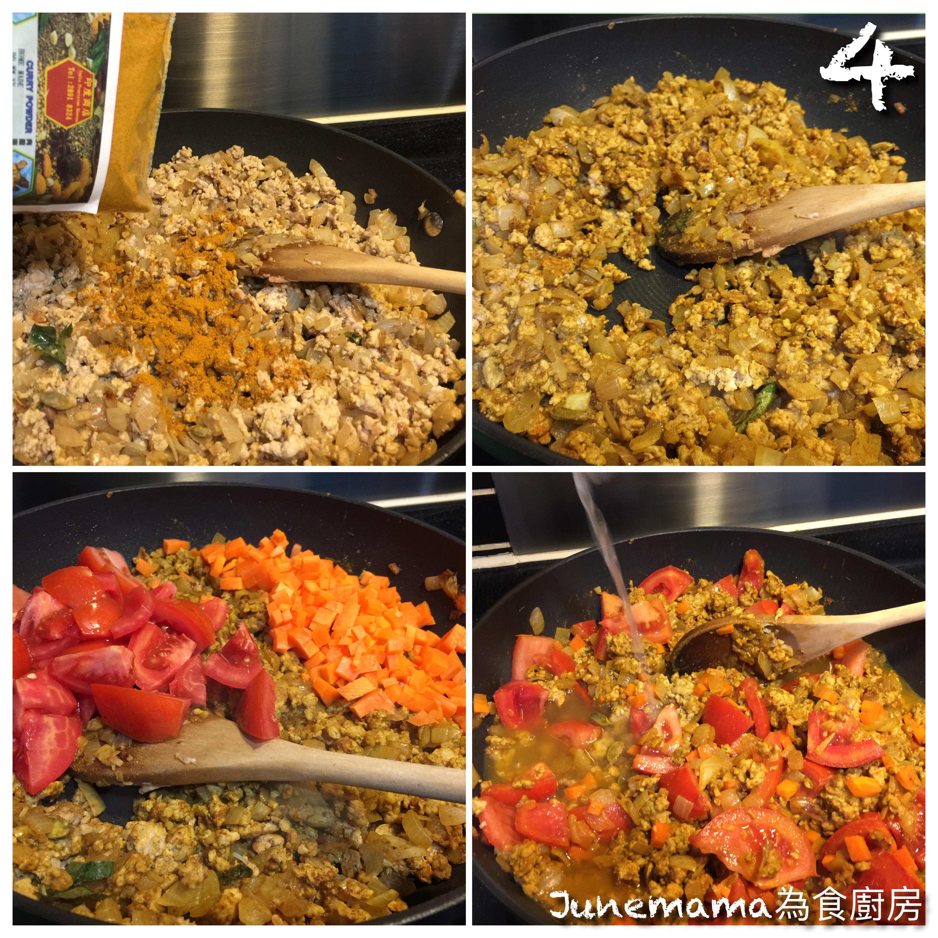 圖4:灑入咖哩粉,炒香;加入蕃茄及紅蘿蔔粒,再倒入水或雞湯至蓋過所有材料。