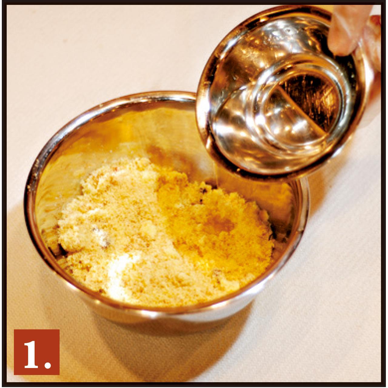 1.乾果牛油紙杯蛋糕放在粉盆中,用手把蛋糕壓成碎,加入橙酒拌勻。