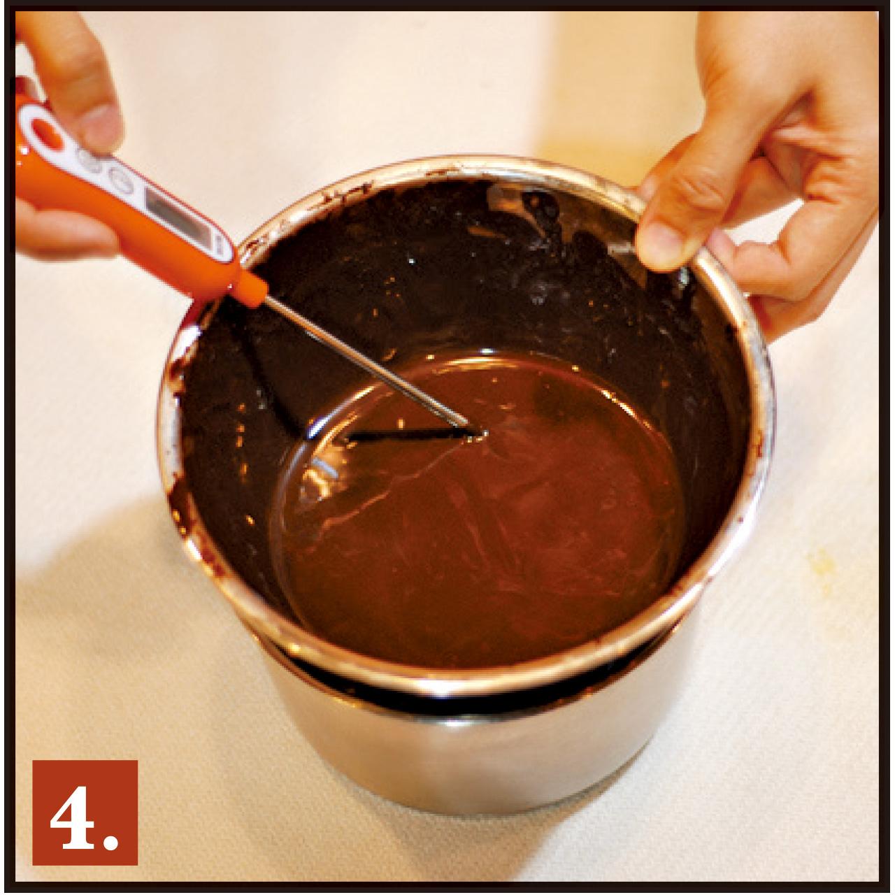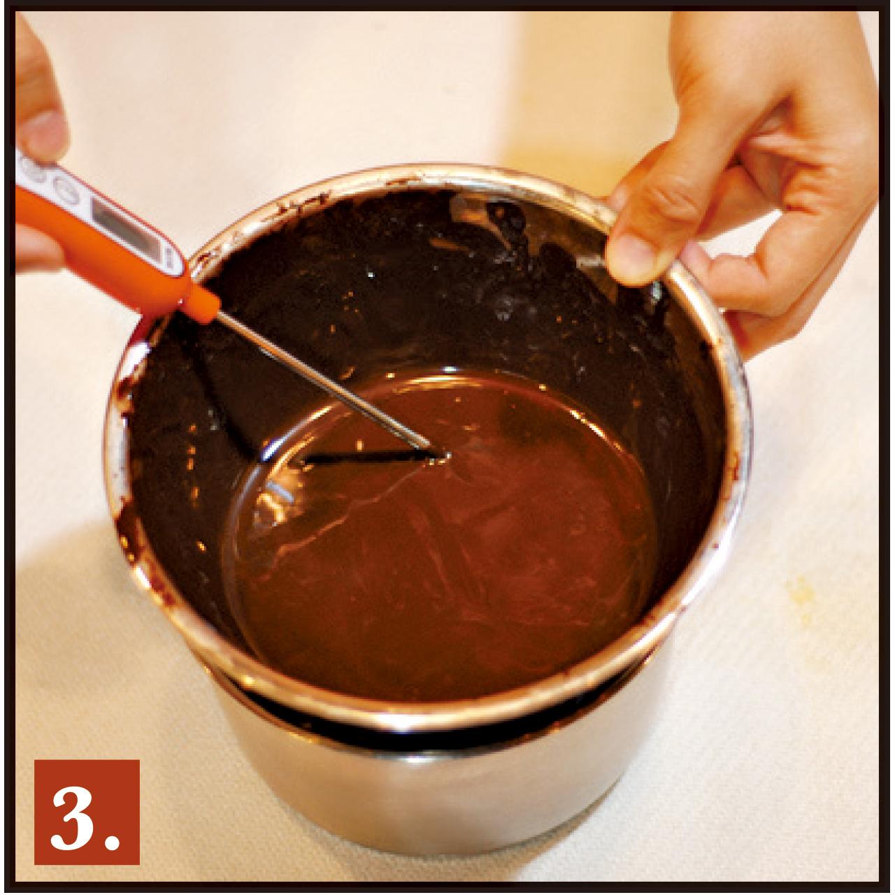 3-4.將黑朱古力粒放在粉盆中,隔熱水座溶,然後調溫(座冷水約3分鐘降溫至27度,再座熱水約5-10秒升溫至30度)。