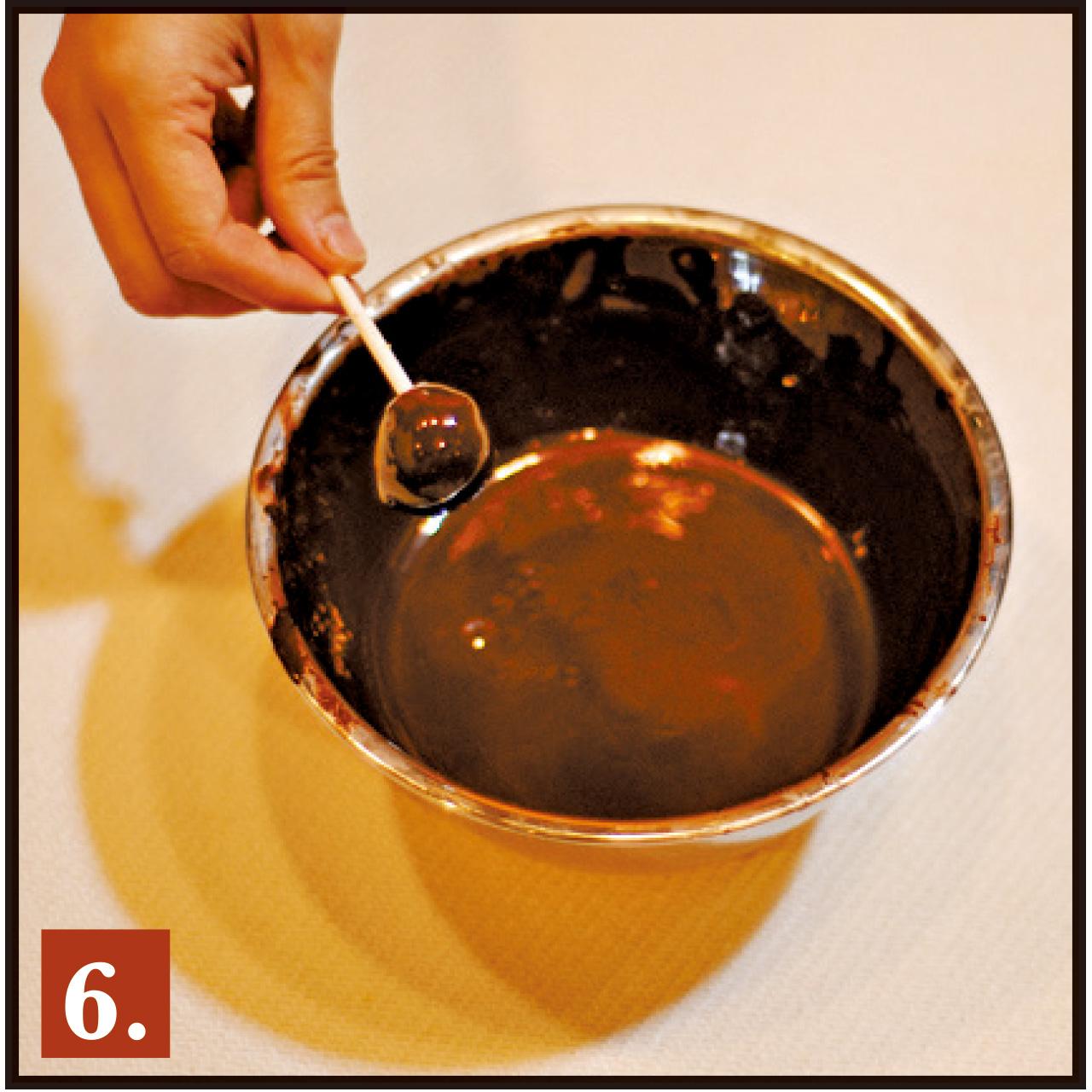 5-6.膠棒一端沾上少許朱古力,插入蛋糕球中,置於雪櫃約3分鐘。取出在整個蛋糕球外沾上一層朱古力,置於雪櫃約5分鐘。