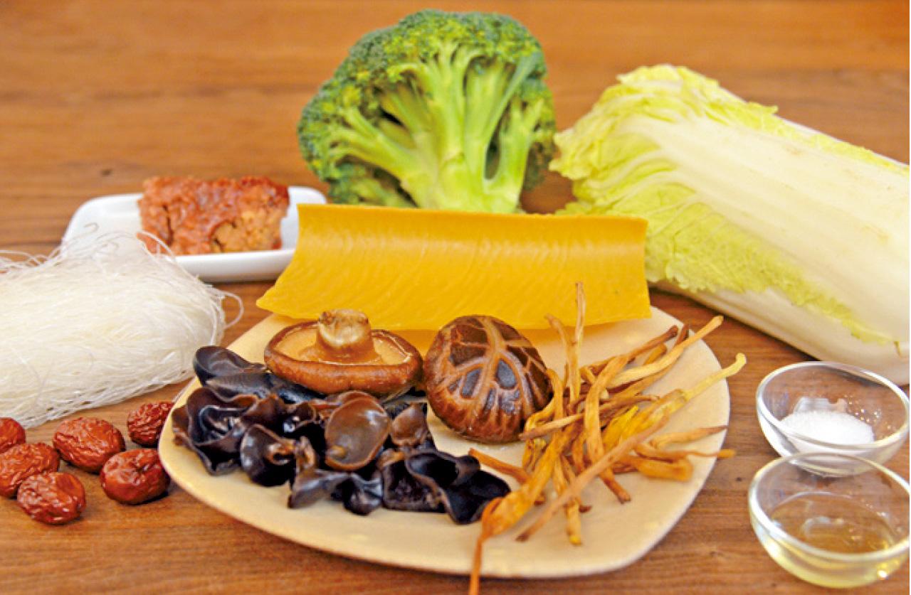 6.用1茶匙油,炒香乾蔥碎,放入南乳及冬菇絲炒香,再放入黃牙白、西蘭花、雲耳、甜竹、紅棗及金針菜,煮至黃芽白軟身,放糖及粉絲拌勻,蓋上鑊蓋略煮2分鐘,盛起即成。