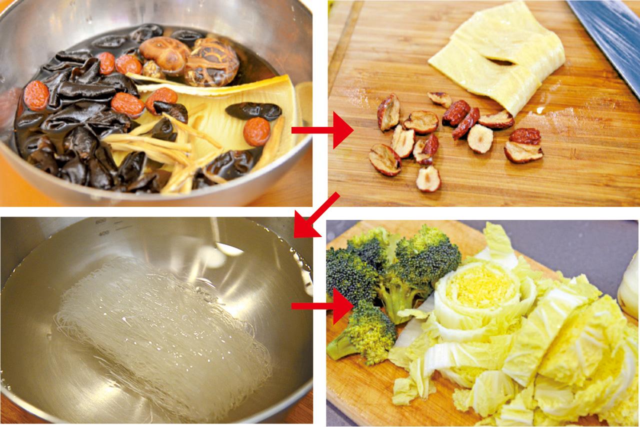 1.先將雲耳、甜竹、金針菜及冬菇洗淨,浸水,雲耳切細,冬菇去莖切絲。