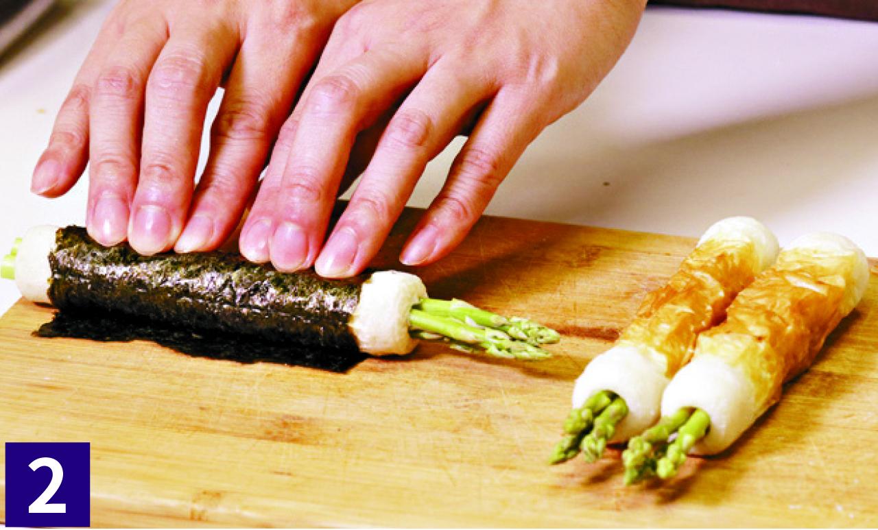 2.竹輪表面灑上鹽,並用紫菜捲起。