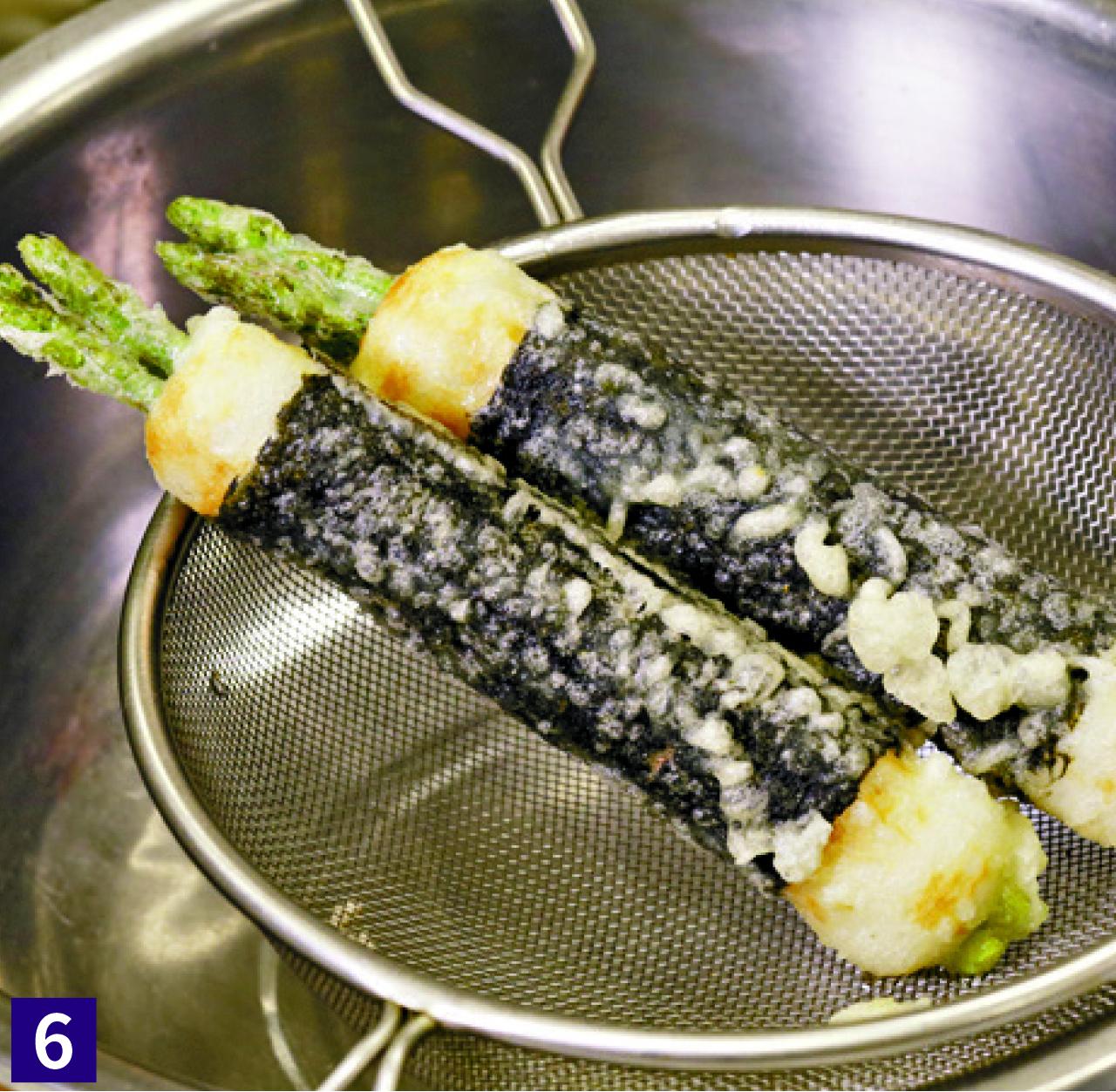 5.灑下少許天婦羅漿測試油溫,油滾後放竹輪卷炸至金黃色,記得用筷子輕輕反轉。
