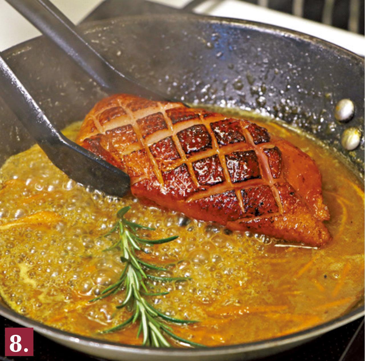 8.熄火把鴨胸及迷迭香放回鑊中吸收醬汁。