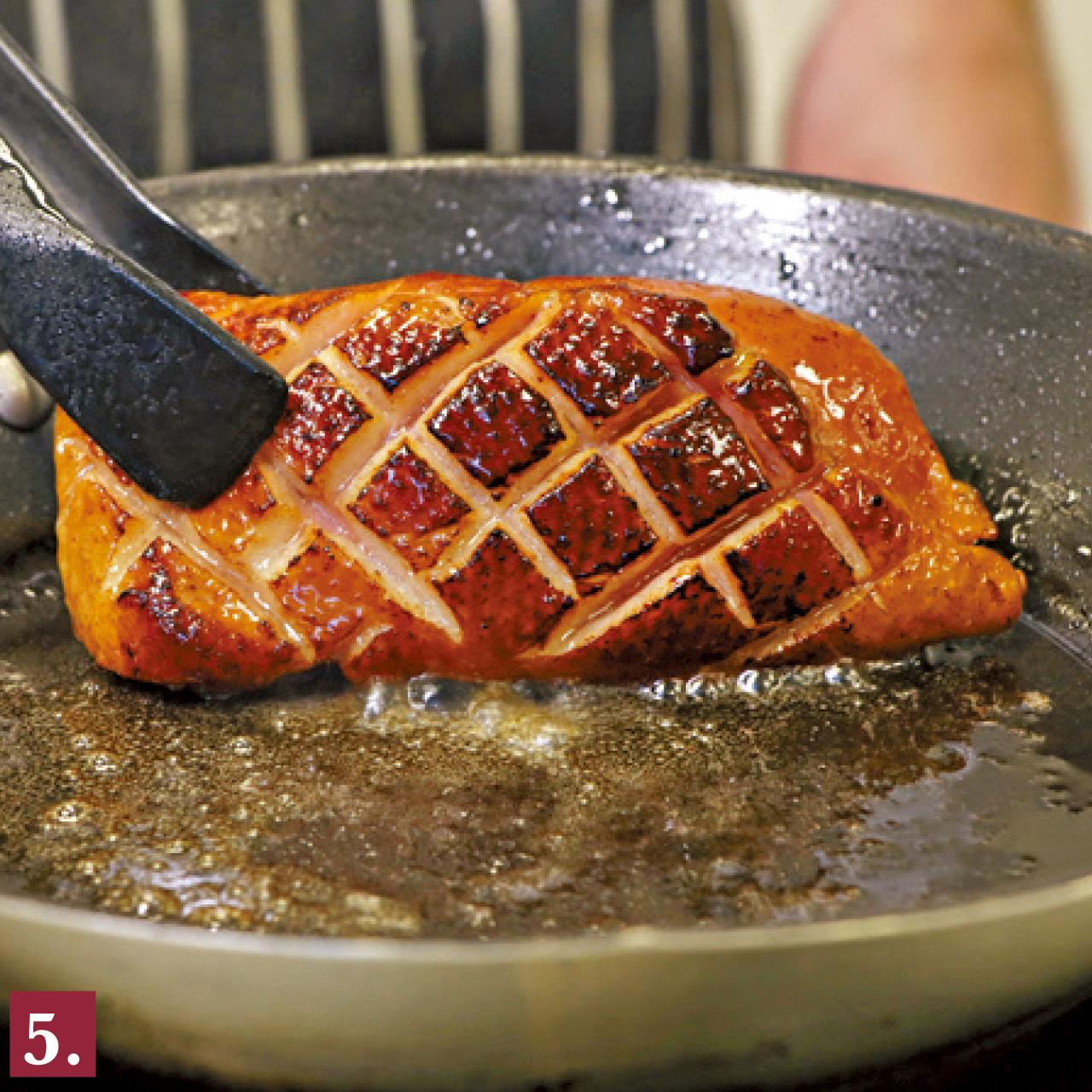 5.開中火,將鴨皮一面向鑊,煎至金黃色後再反轉煎另一面。