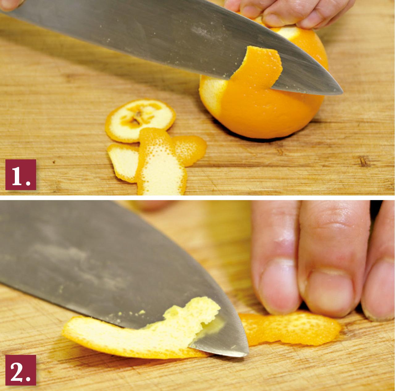 2.攤平橙皮,切去白色部分(去苦澀味)。