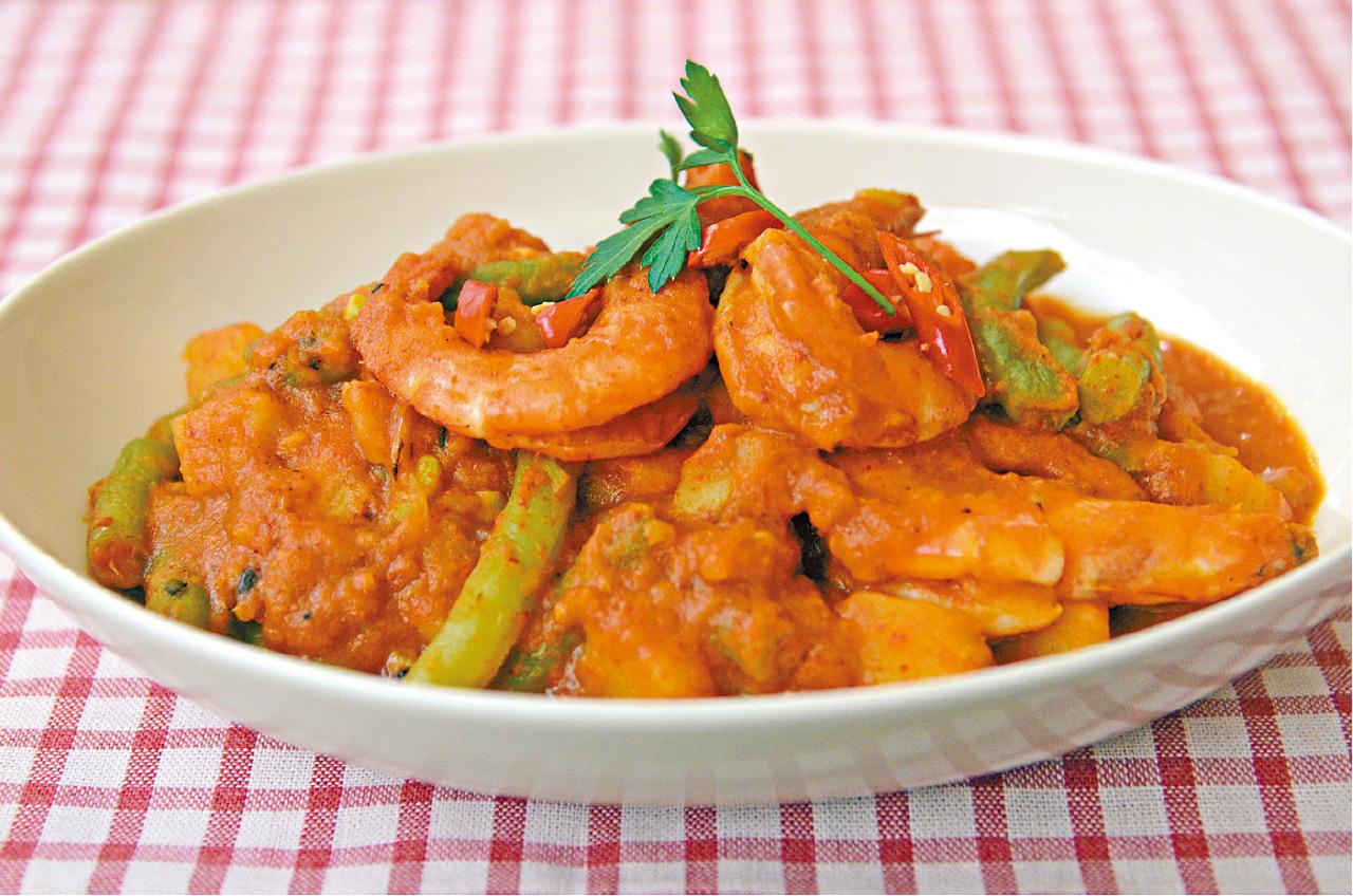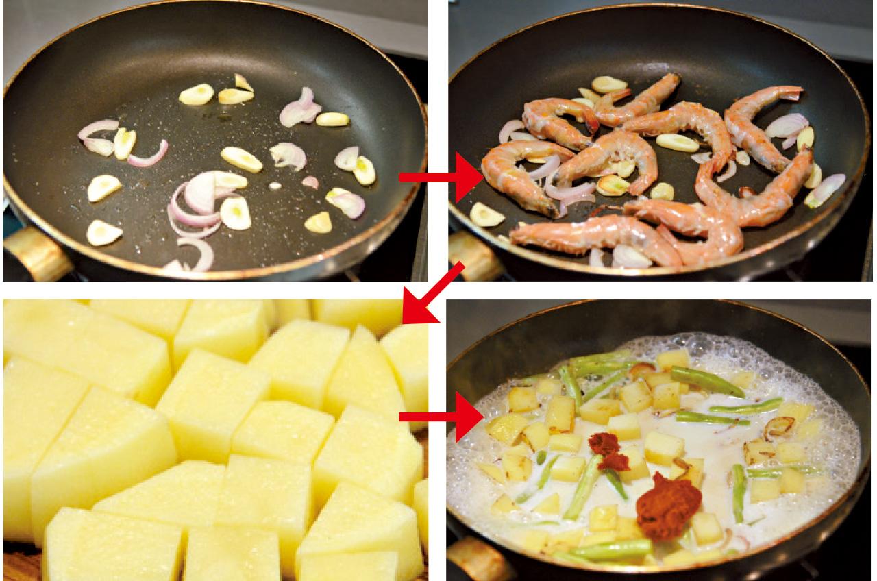 6. 炒香四季豆及薯仔,加入脫脂奶、紅咖喱膏及水,煮至薯仔軟身,放回蝦多煮1分鐘,上碟即成。