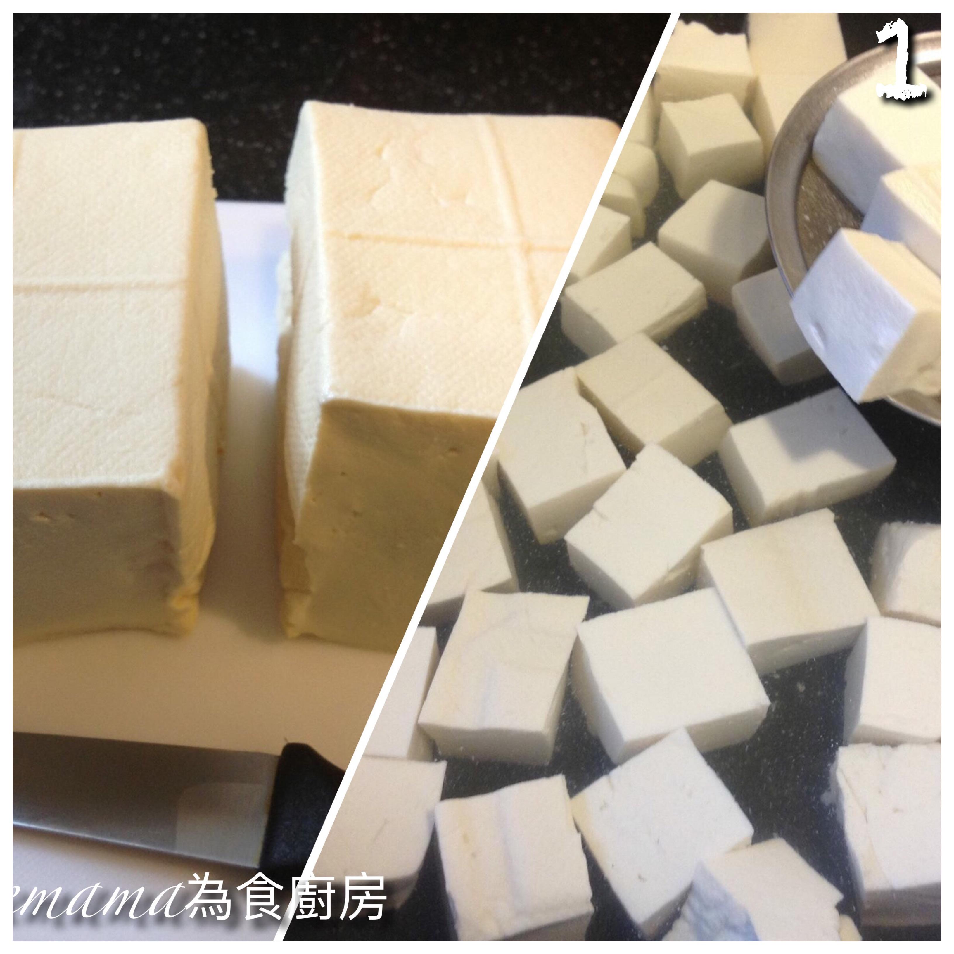 圖1:豆腐2件,切粒,先煮1分鐘左右,不要水滾以免豆腐起孔!