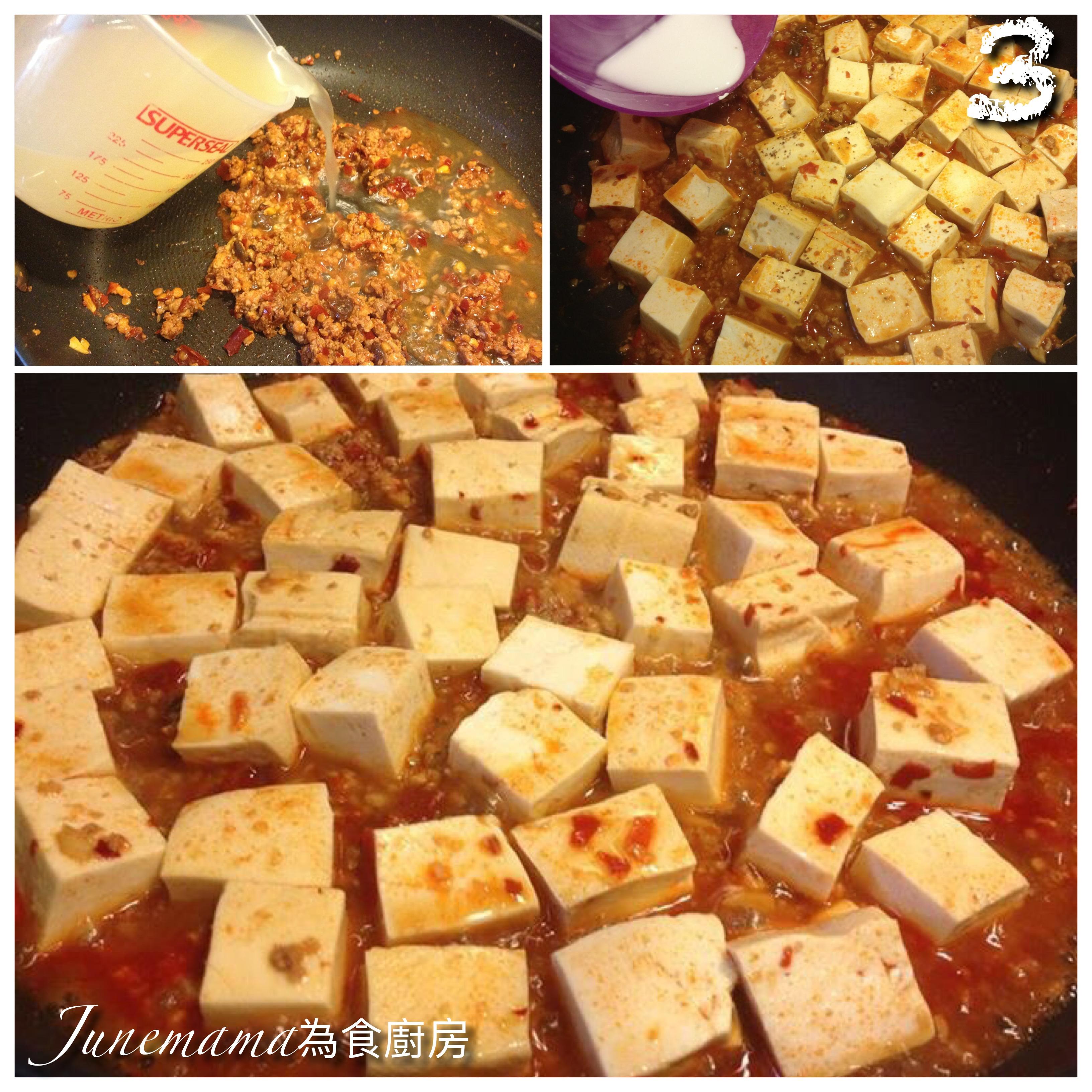 圖3:加入半杯雞湯、豆腐粒、1湯匙糖及少少紹酒,再用生粉水芶芡!