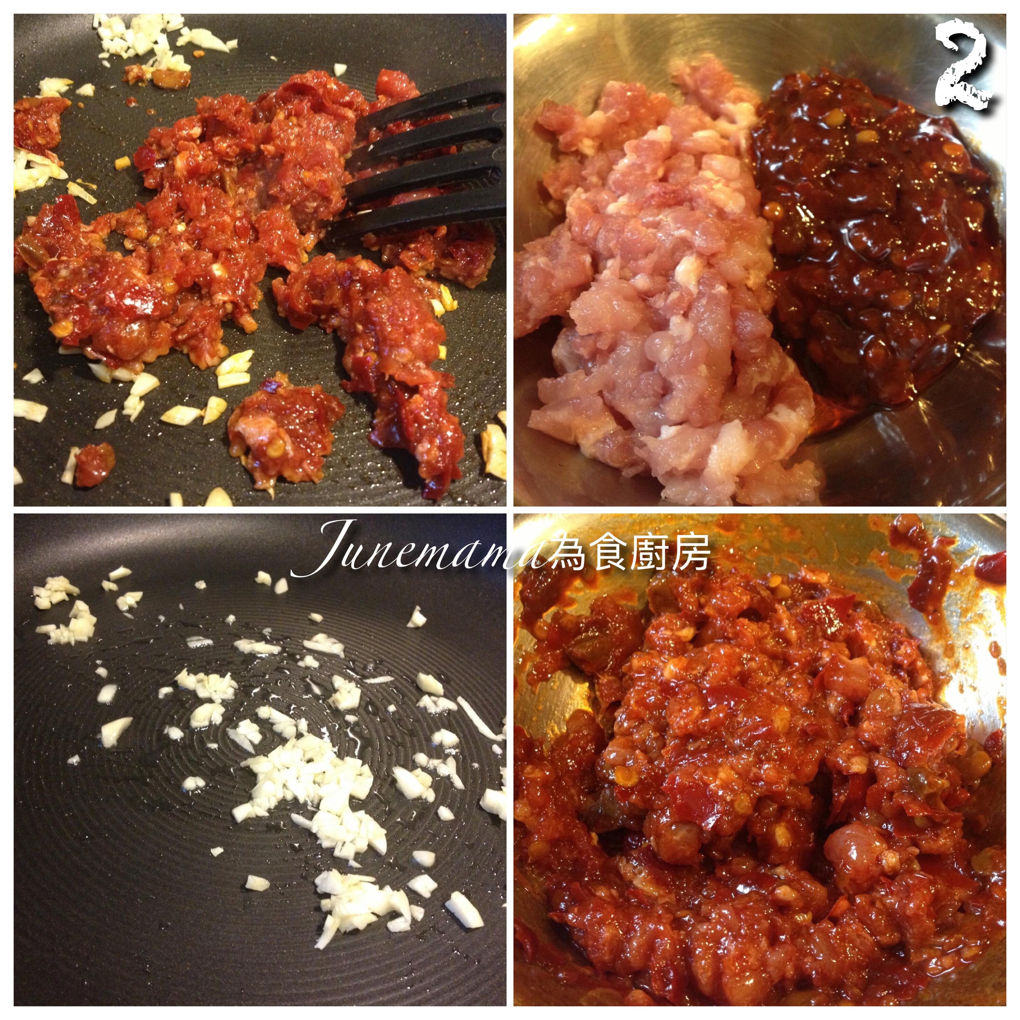 圖2:將50g肉碎+2湯匙豆瓣醬,撈勻醃片刻,然後用2粒蒜蓉起鑊,下肉碎炒香!