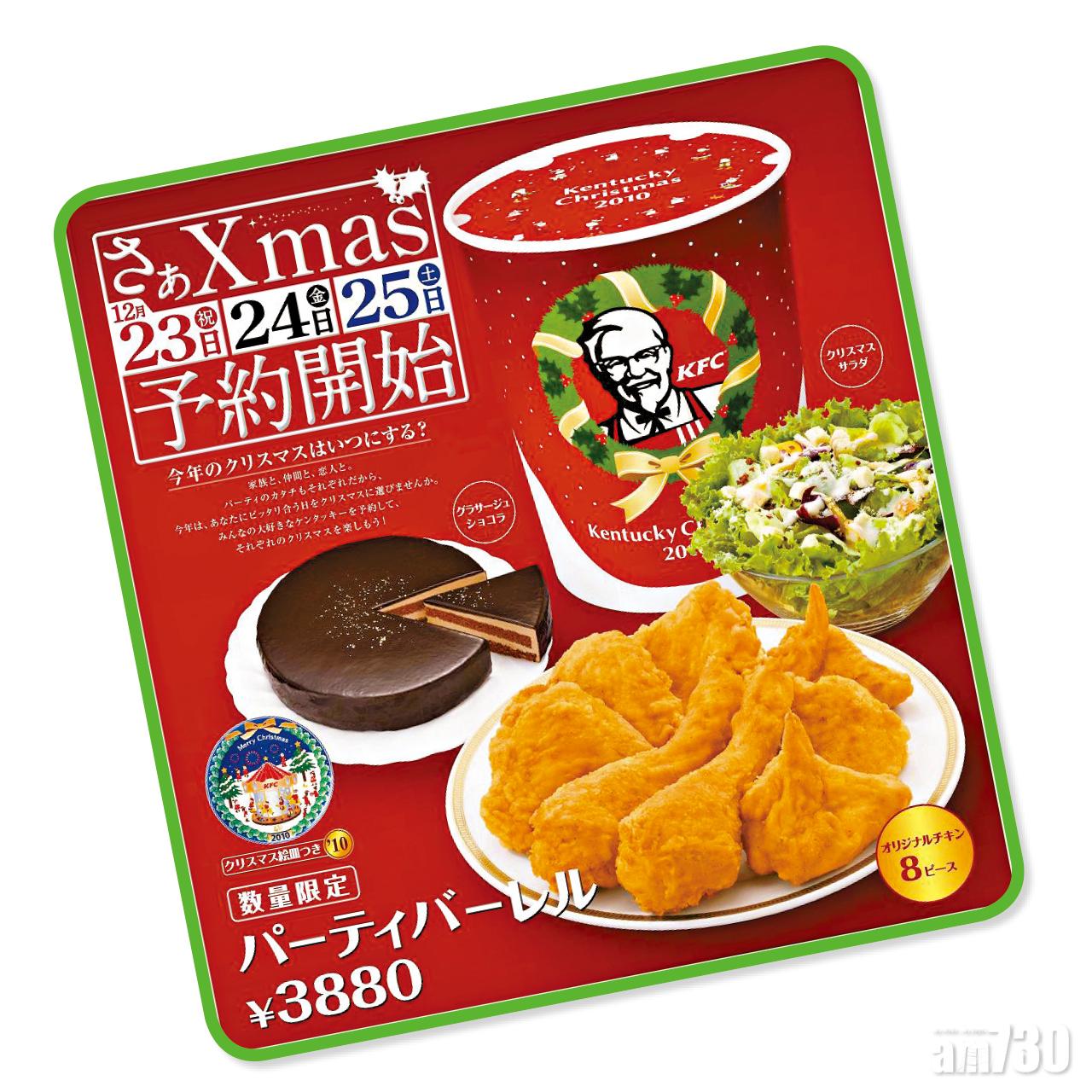 外國人聖誕節愛烤火雞;日本幾十年前,莫講火雞,連焗爐也難求,聖誕要應節,只好吃KFC。1974年聖誕日本KFC「聖誕要食家鄉雞」廣告大熱,從此聖誕派對必吃KFC已成傳統。15年聖誕節一星期,全日本1125間分店,就賺得71億日圓盈利。
