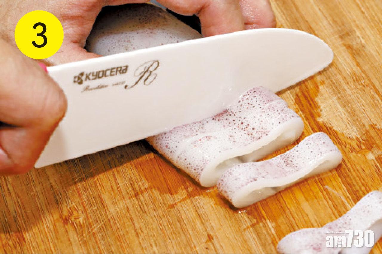 3. 魷魚切圈;蝦去殼,挑腸,洗淨,瀝乾。