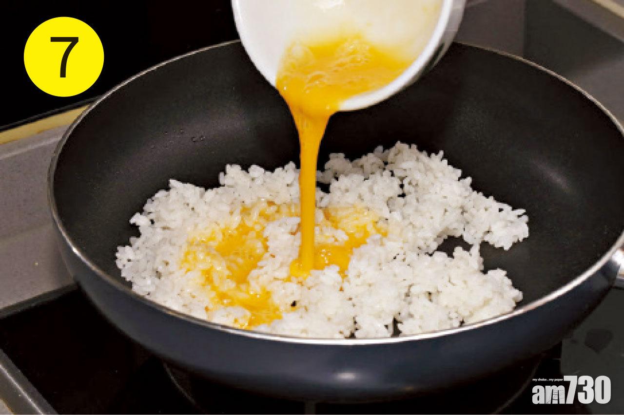 7-8. 燒熱易潔鑊,下油,加入白飯,略炒,加入蛋漿,炒勻,至蛋漿熟透,將炒飯放入焗碟內。