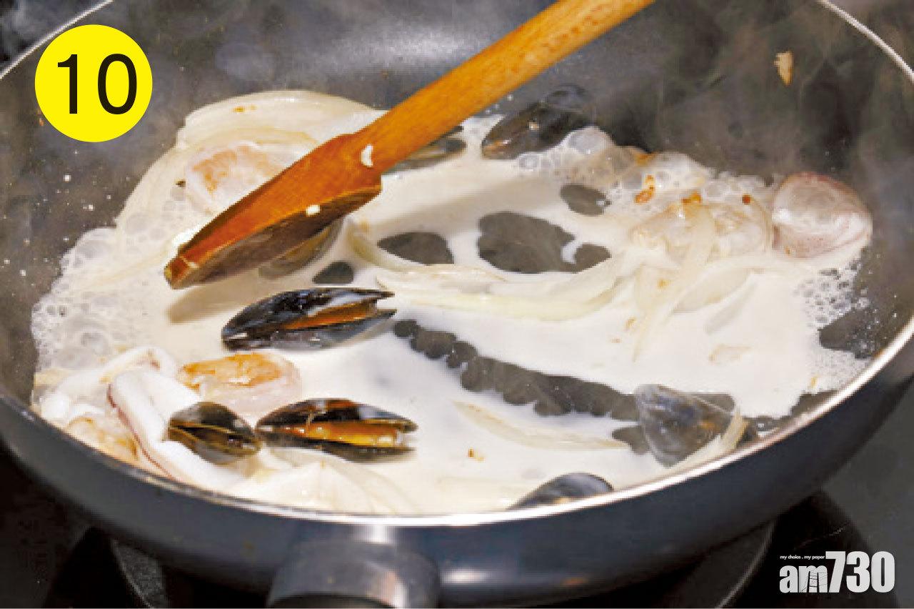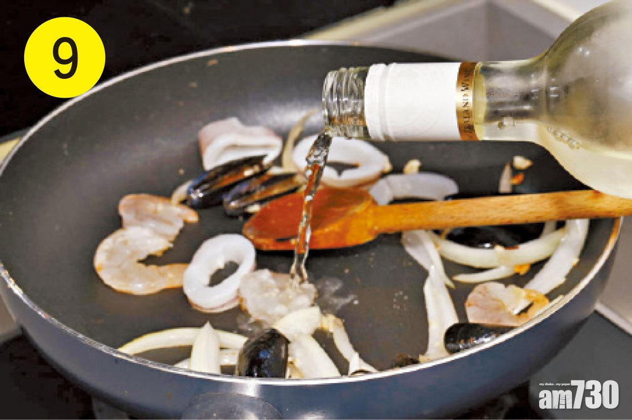 9. 燒熱易潔鑊,加入牛油、洋蔥件和蒜蓉,炒香雜錦海鮮,加入餐白酒,煮至酒精蒸發,盛起。