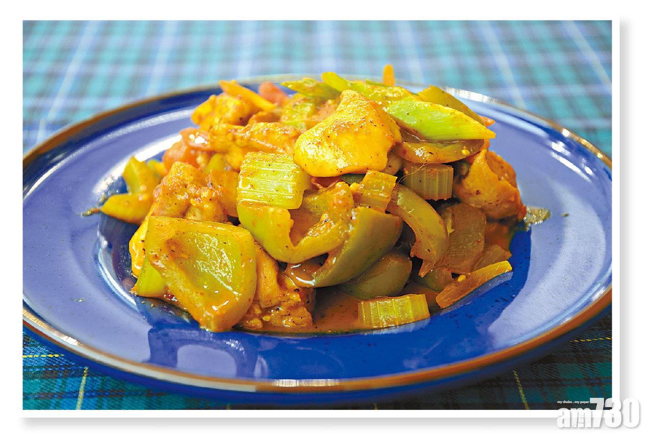 7.放入乾葱頭,炒香,再放青椒略炒,加入大葱、西芹和車厘茄,炒勻後,放回雞件,加2碗水炆20至30分鐘,至青椒熟透軟腍,上碟即成。