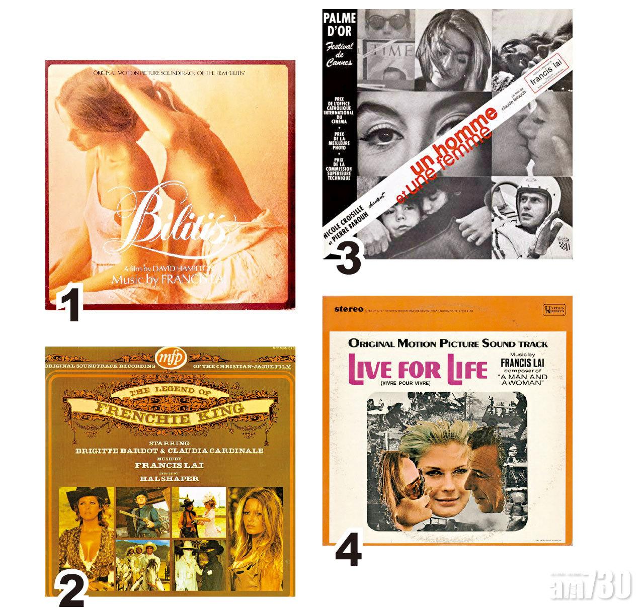 說回Francis Lai初出道成名作,1966年《金像獎》最佳外語片《A Man And A Woman》,港譯《男歡女愛》,主題曲《Un Homme Et Une Femme》(圖3)何是法式浪漫輕音樂不朽名曲,由片中配角Pierre Barouh又演又唱,與Nicole Croisille演繹不同版本,無論是男女混聲「Ba-Da-Ba-Da-Da」純音樂,配上歌詞的合唱版本,又或插曲《Plus fort que nous》,歷久常新,自此Francis Lai與導演Claude Lelouch成為最佳拍檔,緊接1967年《Live For Life》(圖4)一對婚外情的新戀人故事,音樂延伸《A Man And A Woman》同系招牌浪漫之餘,《Theme For Catherine》色士風吹奏,更注入多一層幽怨變奏布局,1970年香港上映譯名為《春蠶絲未盡》,聽落好似鹹片外,更以「盪氣迴腸文藝巨片」介紹,認真有趣。(待續)