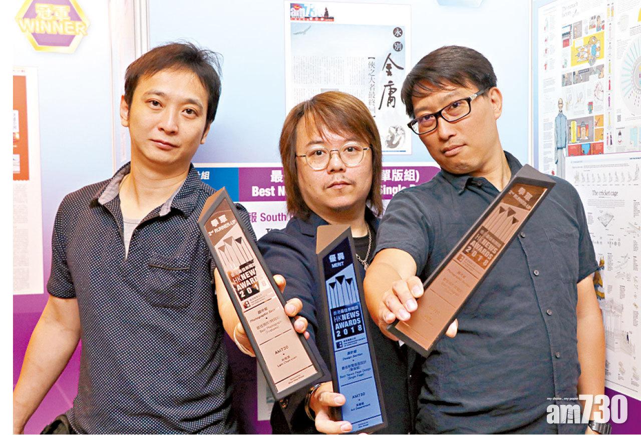 講番個「最佳新聞獎」,比賽分為多個參賽項目,am730今年度榮獲3個獎項,包括2項季軍及1項優異獎,分別由攝記鍾式明(右)憑作品《垃圾暴潮》在「最佳圖片(新聞組)」奪得季軍、攝記林俊源(左)憑作品《先聲奪人》在「最佳圖片(特寫組)」奪得季軍,以及美術組憑《永別金庸 俠之大者最終回》獲「最佳新聞版面設計 (單版組)」優異獎,由創作總監郭銘恩(中)代表領獎。