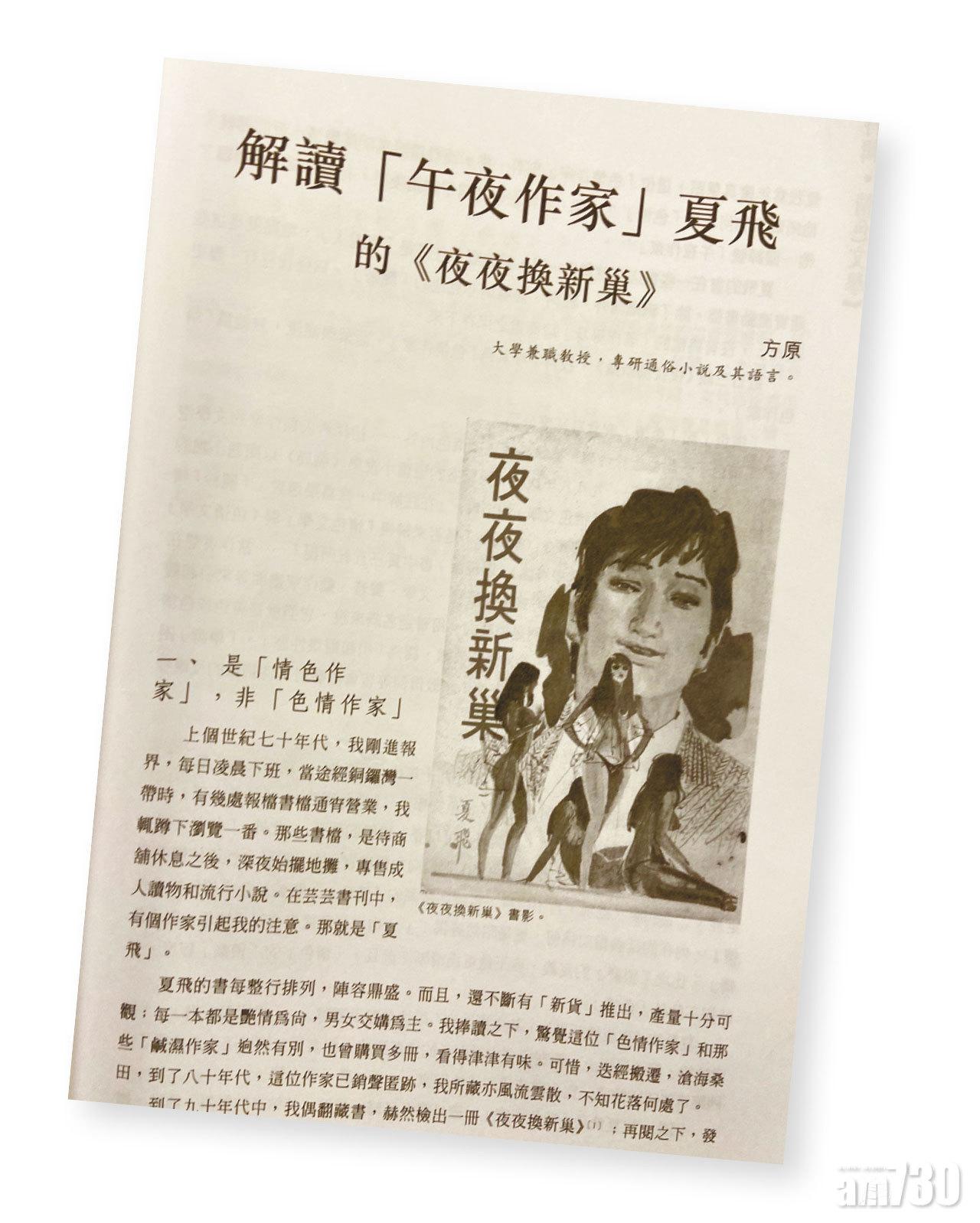 上世紀七十年代香港出現某類色情小說,它們只能夠在午夜時分的報攤見到,日出就會消失,銷售對象主要是夜遊人。我們叫這類小說做「午夜小說」,其中最具代表性的「午夜作家」就是夏飛。