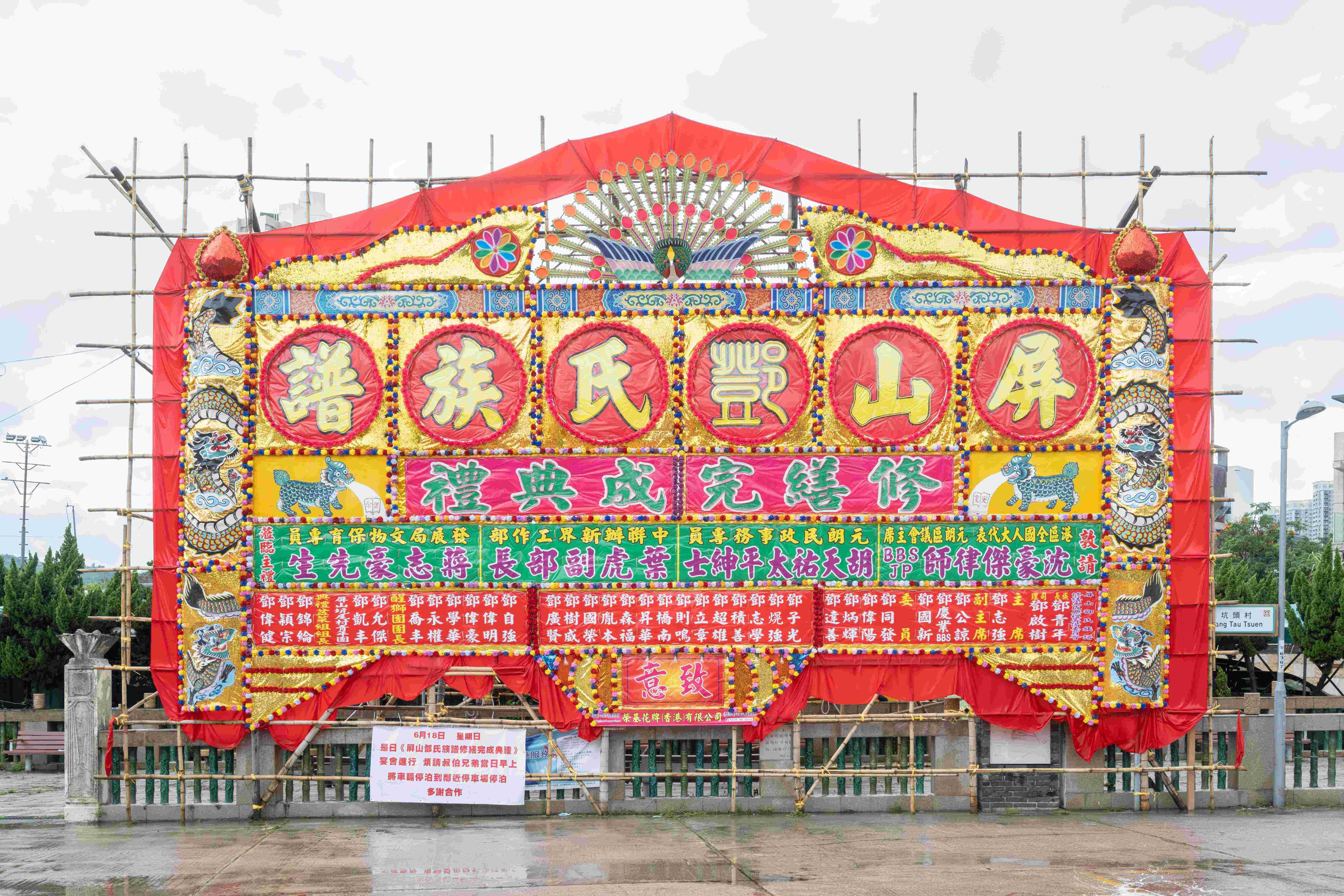 屏山鄧族在會場豎立大型花牌,以慶祝族譜修繕完成。