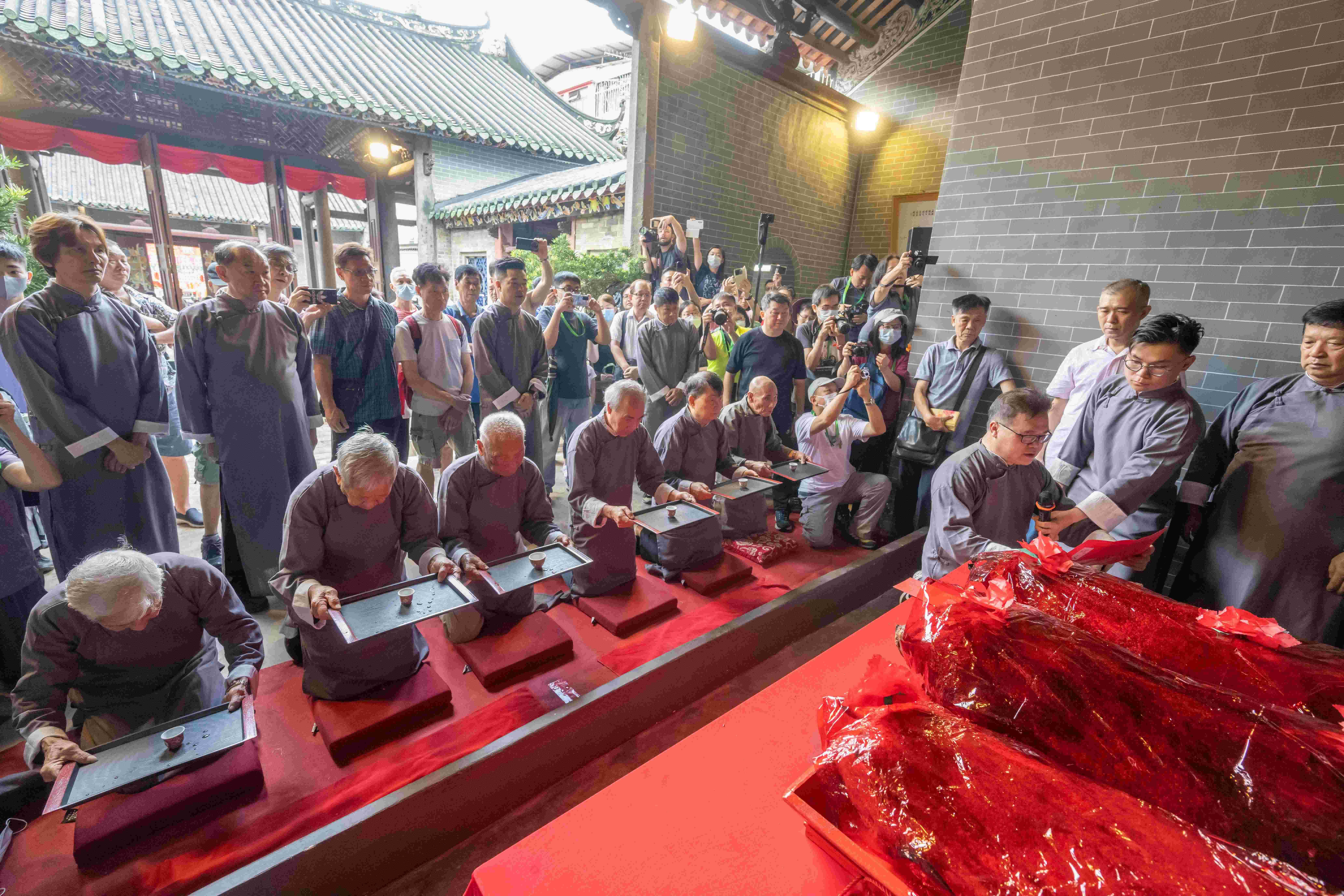 屏山鄧族各房長老穿上長衫,在鄧氏宗祠進行傳統的祭祖儀式,敬告祖先已完成修編族譜。