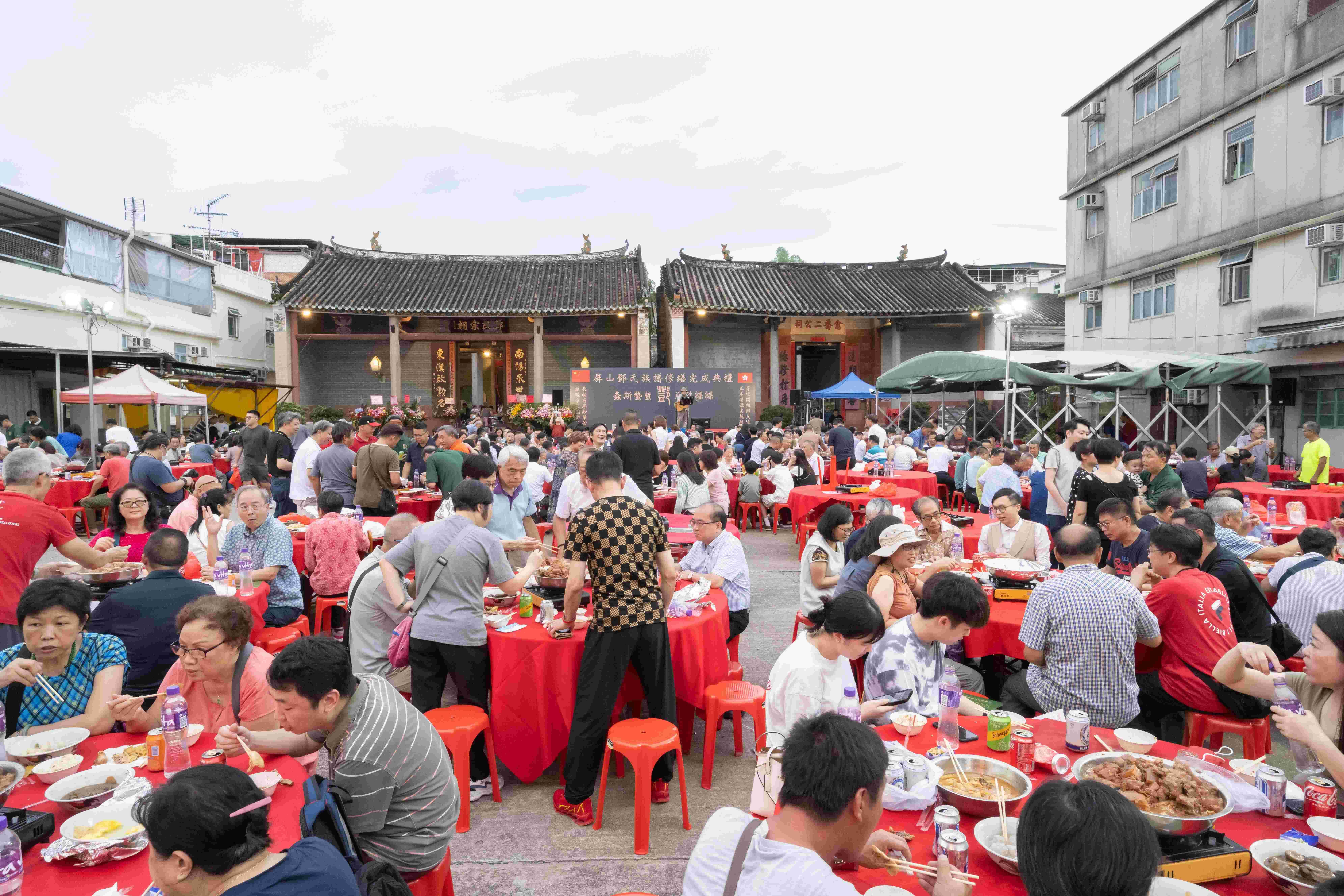 鄧族傍晚在鄧氏宗祠外舉行大型的屏山鄧氏族譜修繕完成典禮,廣邀散居香港、深圳、江西等不同地域的鄧氏族人和賓客,共同見證和慶祝這個重要時刻。禮成之後,鄧族在祠堂前廣場舉行千人盆菜宴,所有族人不論貧富和地域均可參加,代表宗族子弟平等相待,和嘉賓打成一片。