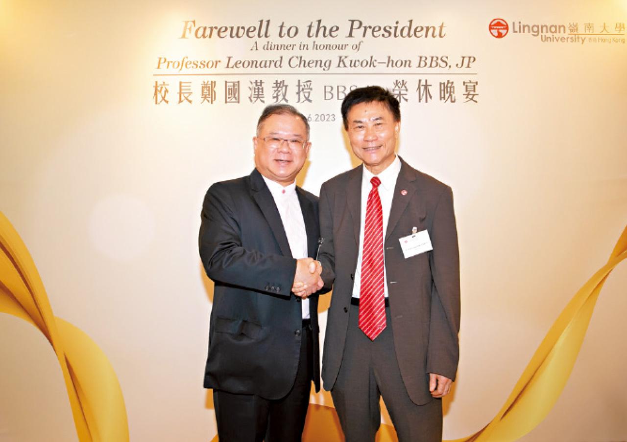 筆者出席嶺南大學校長鄭國漢教授榮休晚宴並和鄭校長合照。