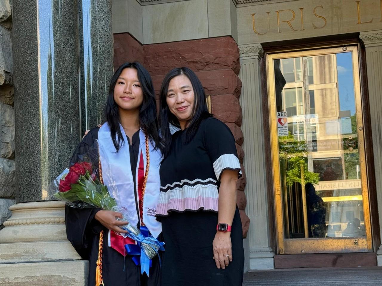 我和披着畢業袍的女兒,在康奈爾大學圖書館門前。(筆者提供)