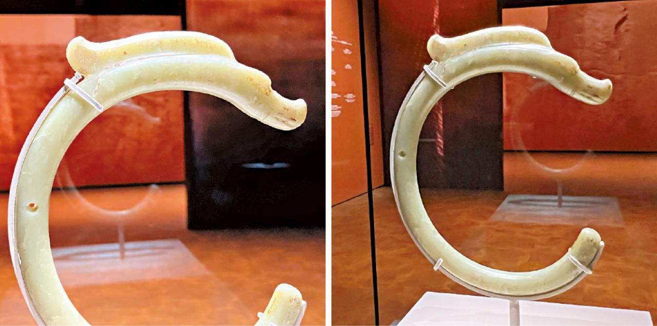 第一件介紹的展品「龍」屬紅山文化中晚期(距今6,000至5,000年)文物,遺址分布在中國內蒙古和遼寧一帶。據介紹,龍在中華文化當中象徵帝王、傑出,此玉質製成的「龍」將中華文明兩大重要元素玉和龍結合,具代表性。中華文明溯源展覽策展人黃煒均介紹,在紅山文化中晚期牛河梁遺址發現別具規模的寺廟、壇及石墓,他解釋,在紅山文化當中,身份尊貴人士會以玉器作陪葬品,而玉器從高等級墓葬出土被視為等級象徵,同時表達玉在紅山文化佔重要地位。