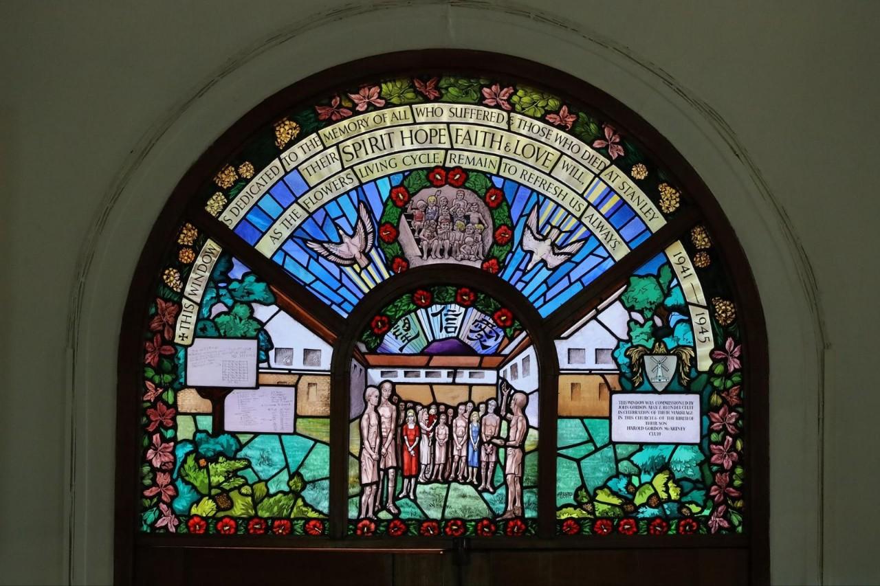 小教堂彩繪玻璃上描繪昔日拘留營的景象,骨瘦如柴的戰俘和飢餓的兒童,聚首禱告,上方一對振翅高飛的鴿子,展示受難者憑着信、望、愛的信念渡過艱辛的日佔歲月。