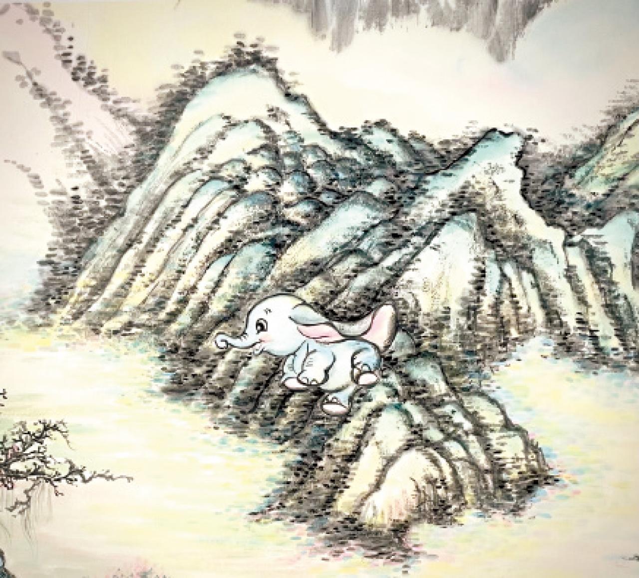 一進門,看到一列國畫,線條閒熟,構圖工整,但細看之下,竟然發覺山水之間有一隻卡通小飛象,輕舒笑臉,寫意翱翔。正感奇怪之際,忽然又發現在河畔溪邊,有一條漫畫大鱷魚,不張大口,只在潛藏暗笑。在傳統國畫的功底下加入現代元素,演變出這種新風格,名家巨匠也許會感到貽笑大方,破壞規矩,褻瀆先賢;但其實演變就是一種永恆,中國的文字不是由甲骨文、象形文字、篆書、隸書,再演變出草書、行書、章草、楷書以至今天的各種字體嗎?